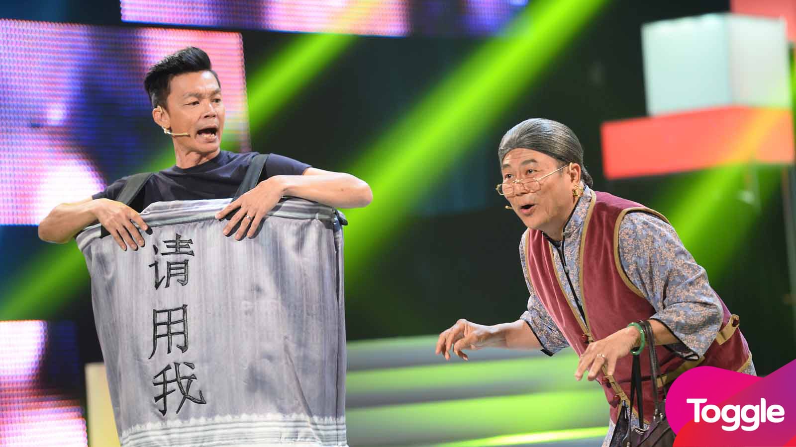 Han Wei is dressed as his character as an old father in The Journey: Tumultuous Times and Hui Fang is dressed as her 99-year-old character in Good Luck.