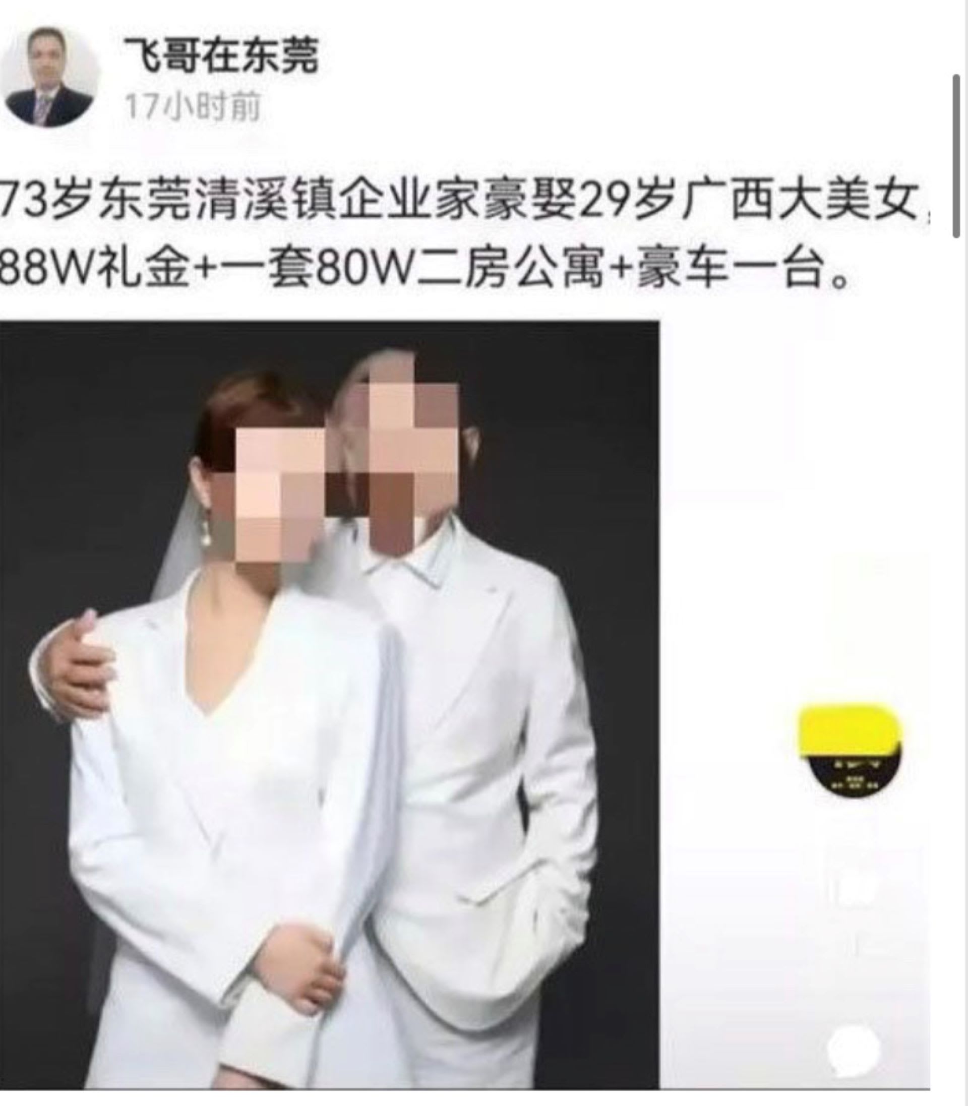 Netizens were further drawn to the story when a Chinese blogger, who went by the moniker "Brother Fei is in Dongguan", spiced things up and wrote on Chinese social media platform Toutiao that the photo showed a 73-year-old "groom" who showered his 29-year-old “bride” with gifts that included 880,000 yuan (S$165,327) in cash, a new two-bedroom apartment and a luxury car.