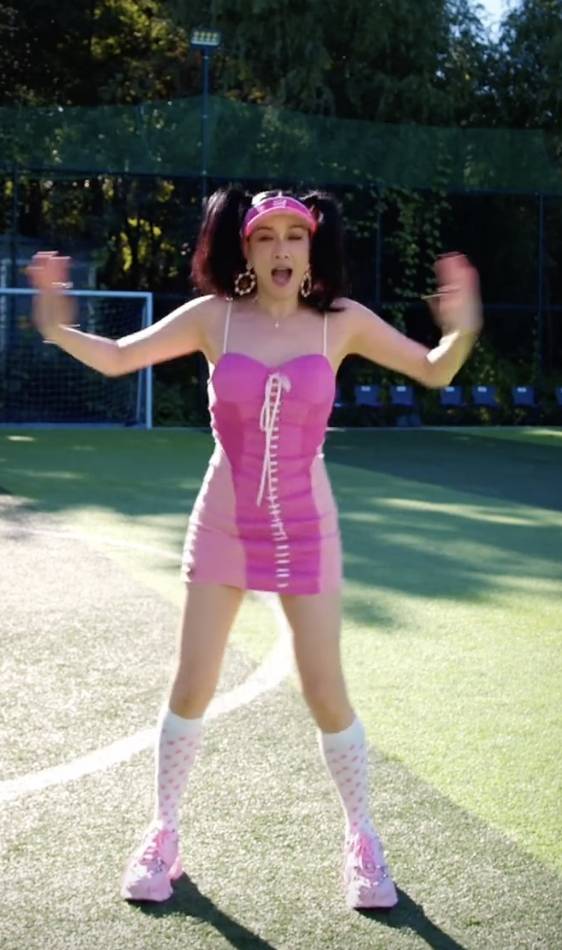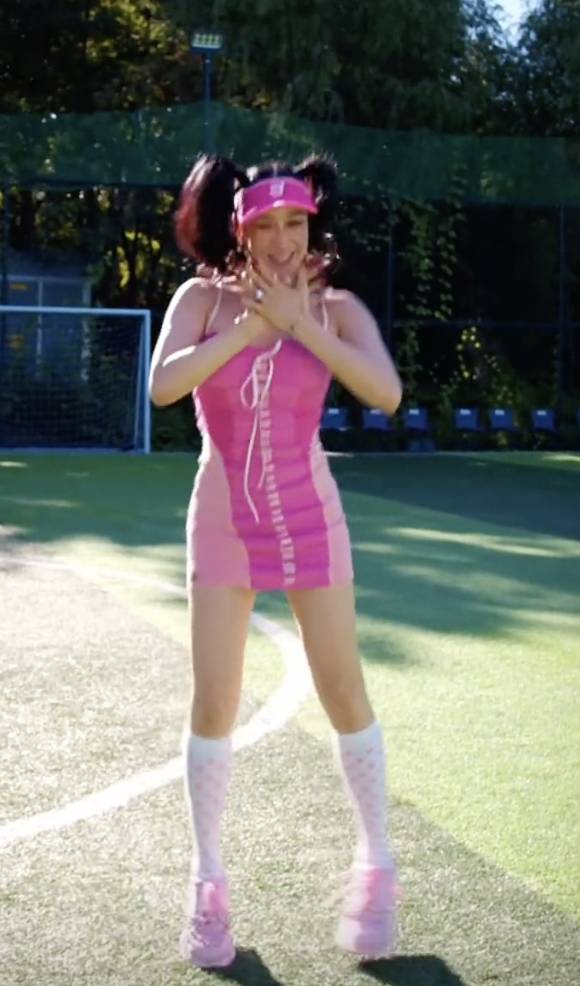 In the video, Christy can be seen wearing a skin-tight hot pink dress, with her hair up in pigtails and accentuated by a Barbie-esque visor. Her outfit was completed with pastel pink sneakers and white high socks with tiny pink hearts.