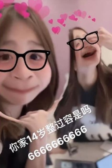 Pinching her nose and rubbing her eyes while doing the "6" hand gesture, which means "impressive" in Chinese internet-speak, Cayla wrote: "Your family does plastic surgery at 14? 6666666666."