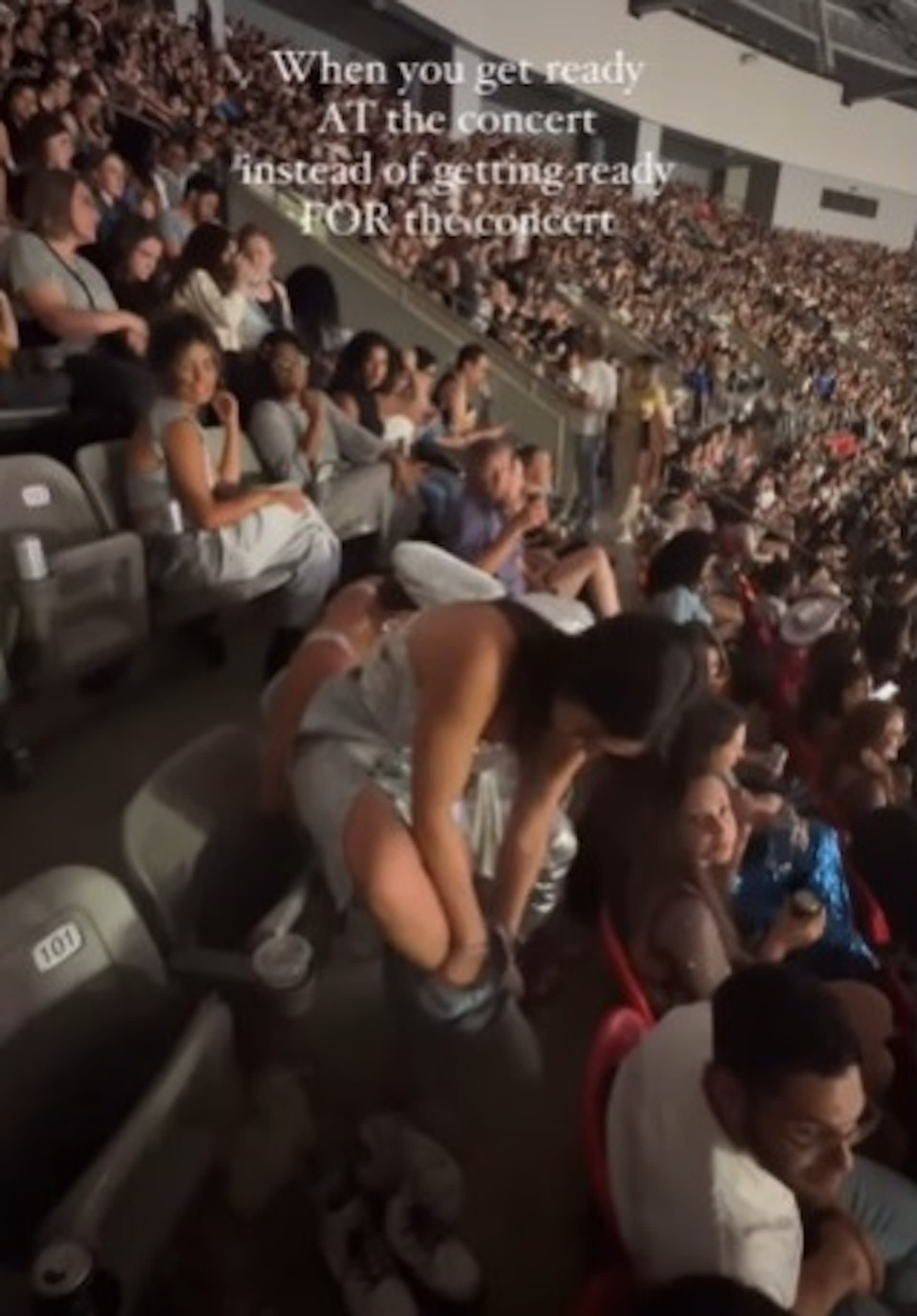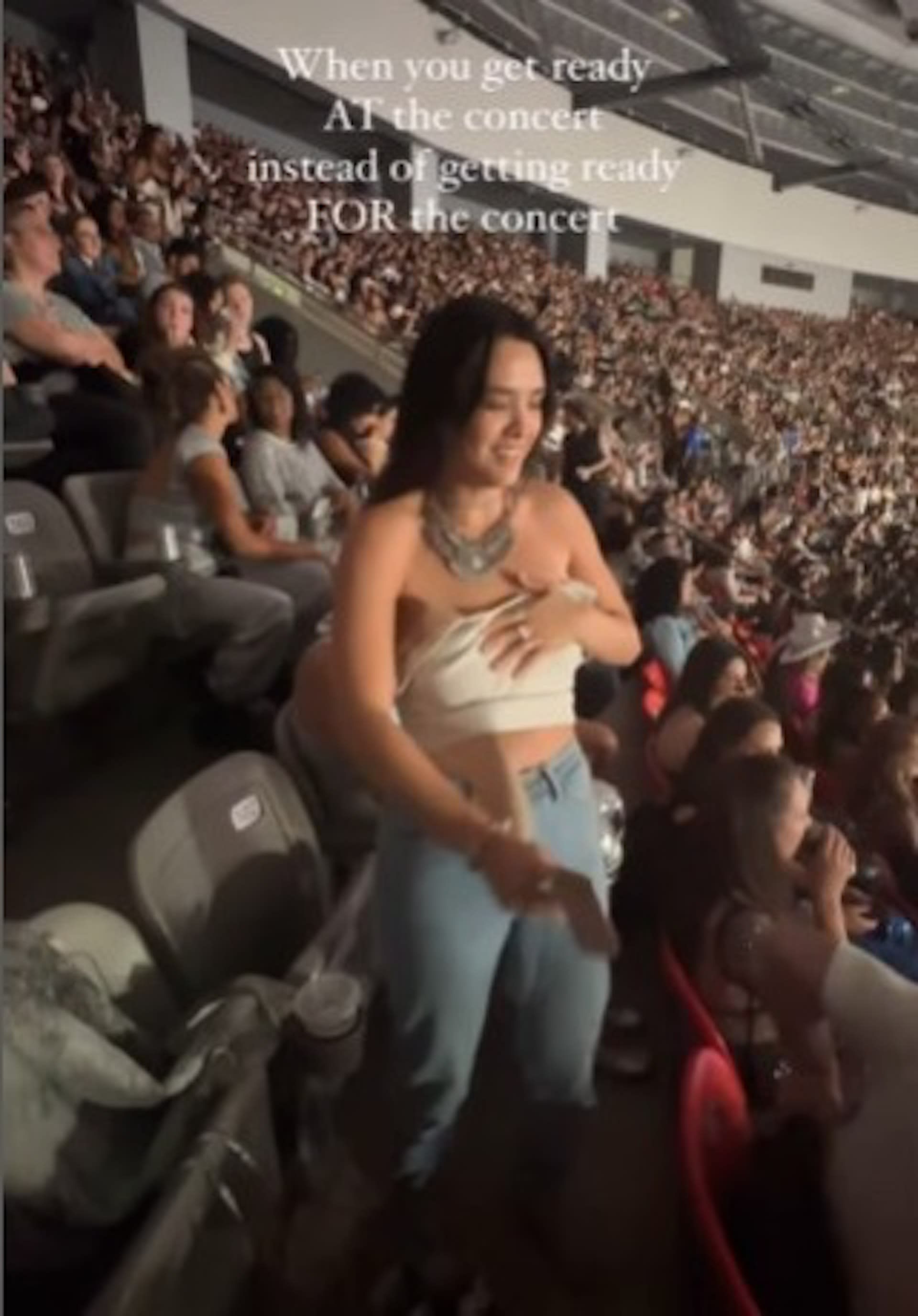 In the video, Yasmine, who was standing among a bunch of other fans at the stadium, started to pull down the straps of white tank top. Then, she reached under her top to unbuckle her bra before pulling it out.