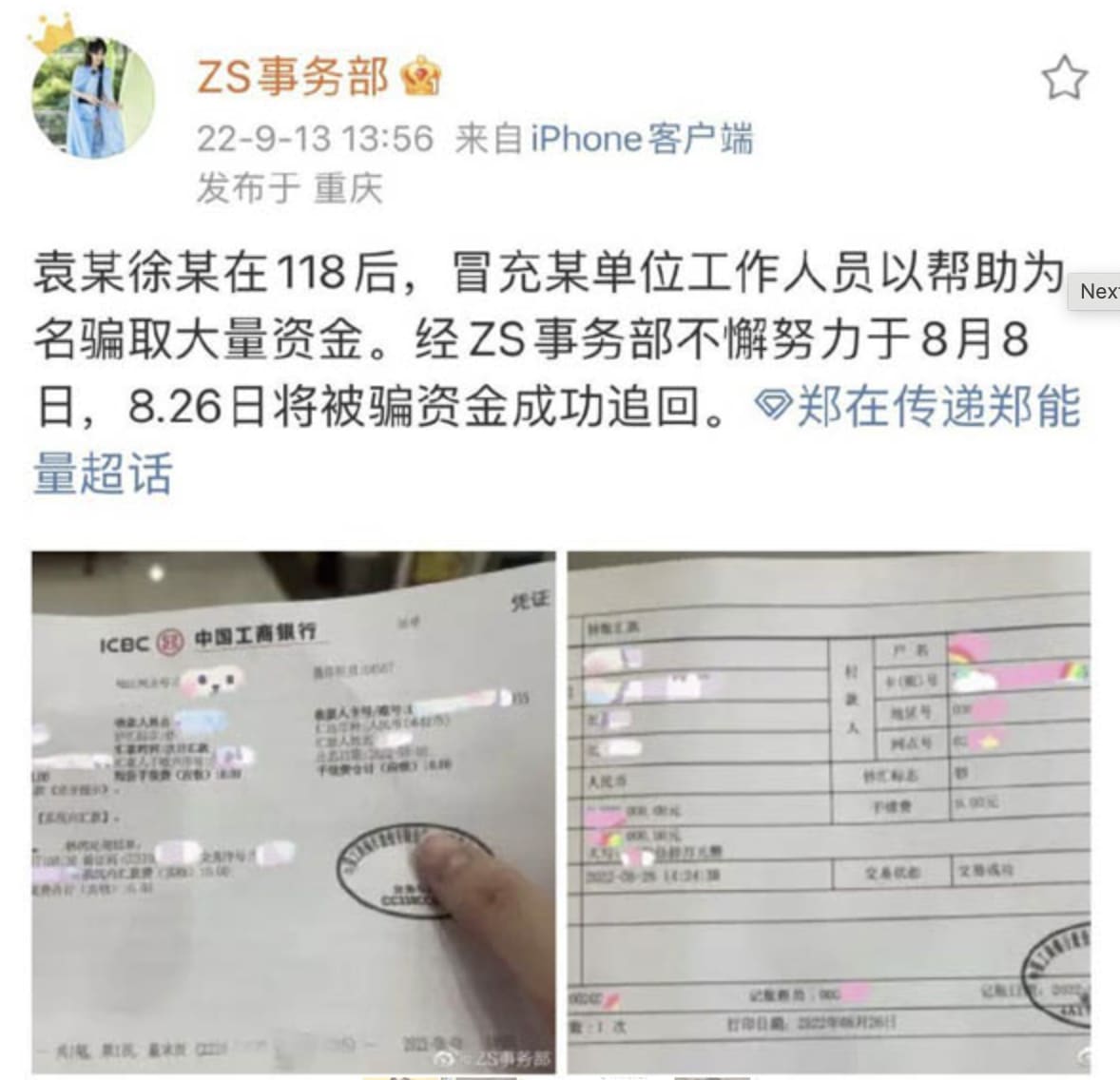 The day after her grand return to Weibo, Zheng Shuang shared a post describing how two people pretended to be her staff, and tried to scam a huge sum of money from others. She then wrote that her management was successful in getting the money back.