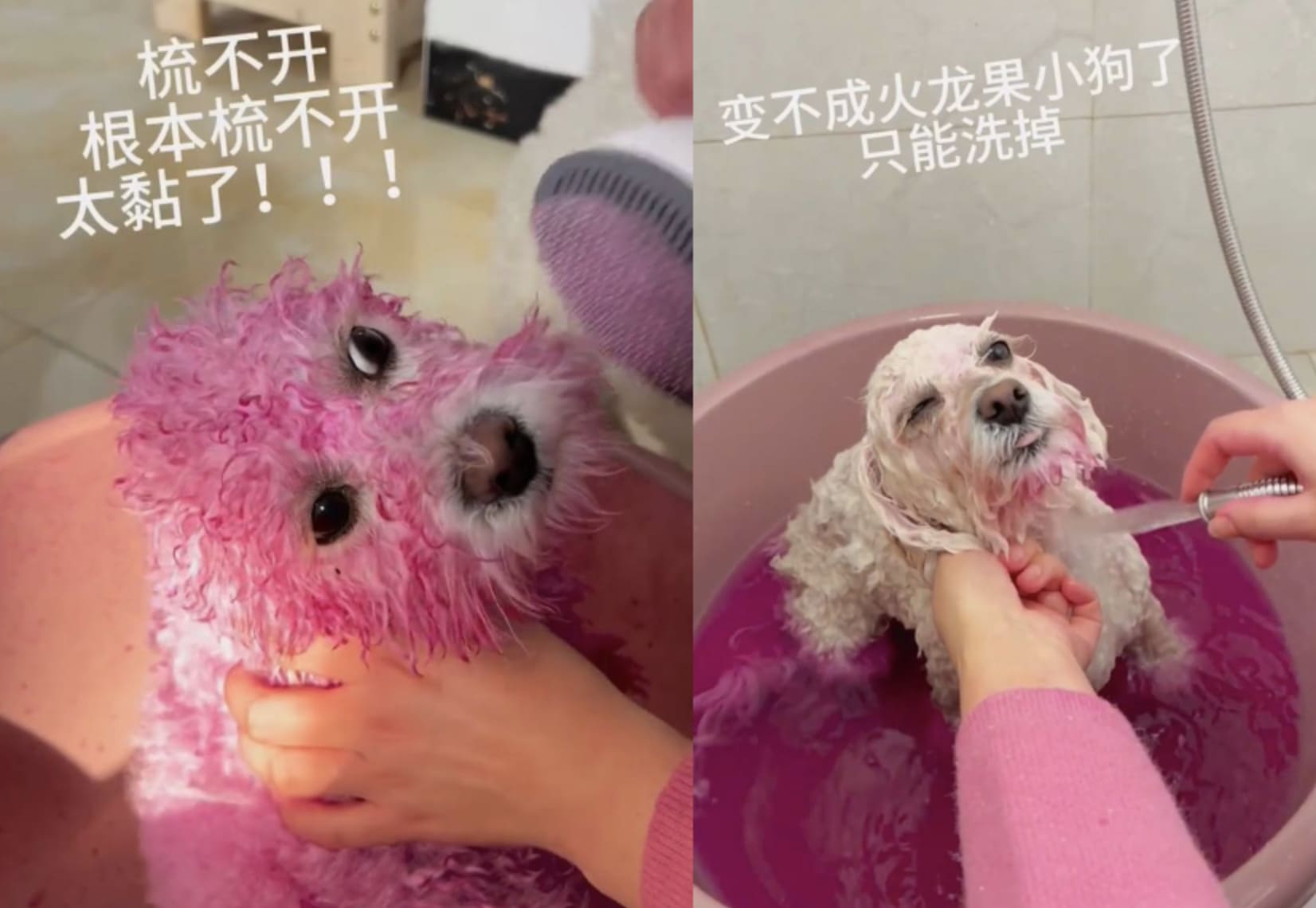 One video showed the pup’s fur getting all tangled and sticky after too much dragon fruit juice was applied to it.