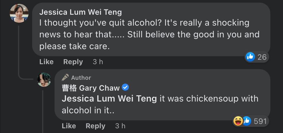 “I thought you’ve quit alcohol? It’s really a shocking news to hear that (sic),” one fan commented, to which Gary responded: “It was chickensoup (sic) with alcohol in it.”