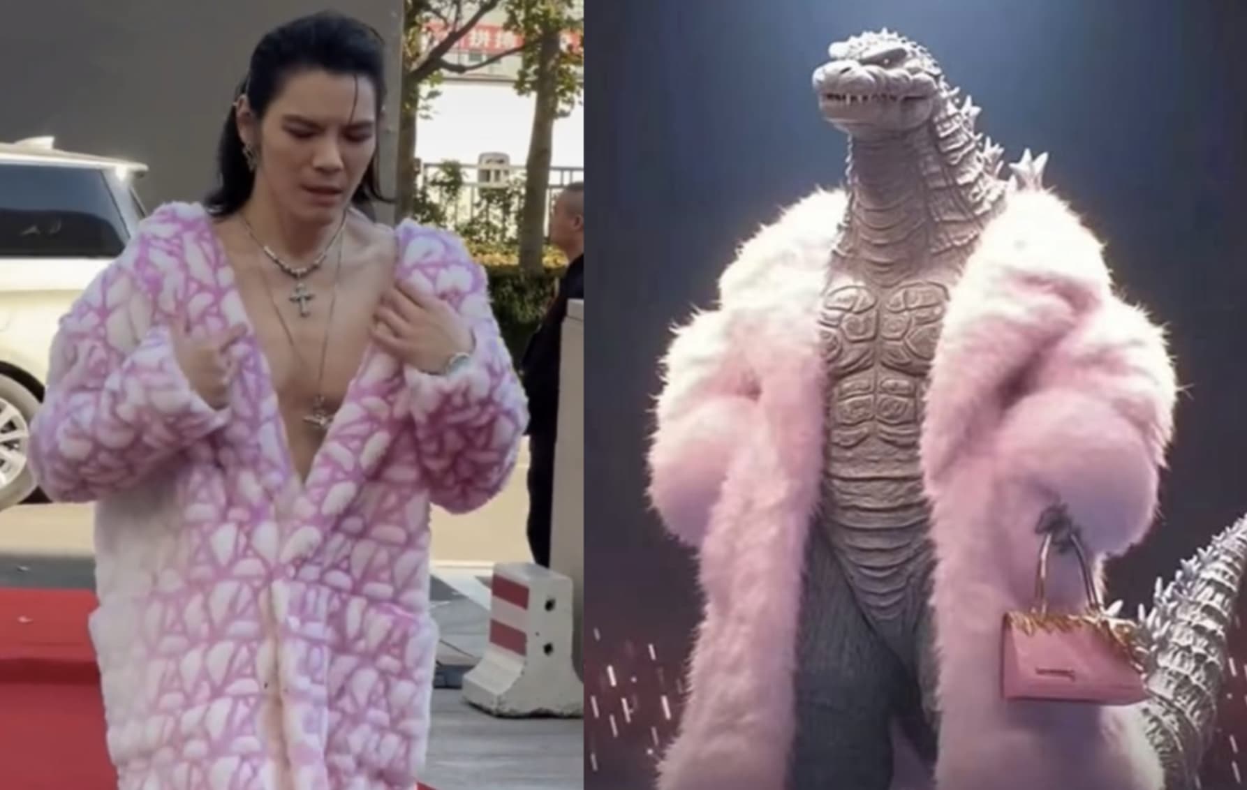 Netizens were extremely tickled by his ‘outfit, with one doing up a photo of a Godzilla dressed in a pink fur coat.