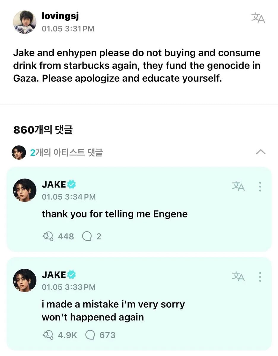 K-pop idol and ENHYPEN member Jake has found himself in a predicament for drinking Starbucks coffee during a recent live stream.