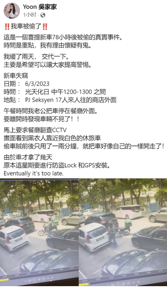 Yesterday (Mar 8), Malaysian jock Wu Jia Run (吴家润), AKA Yoon, took to her Facebook page to share that the car she just bought had been stolen.