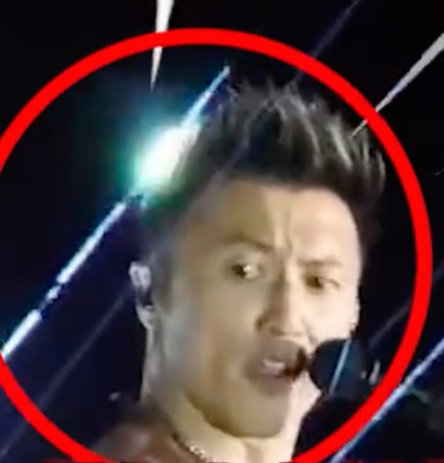 While performing at the Chongqing Olympic Sports Stadium, Nic was rocking out on his electric guitar mid-song when a laser beam suddenly struck the side of his head. He quickly tilted away, frowning and glancing to the side in visible shock.