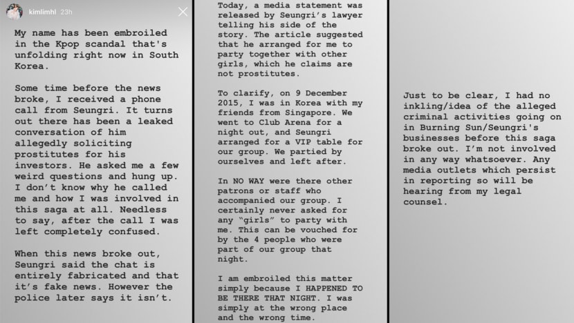 Local socialite Kim Lim, who is known to be good friends with former BIGBANG member Seungri, says she “had no inkling/idea of the alleged criminal activities going on in Burning Sun/Seungri’s businesses” before the disgraced K-pop star’s nightclub and prostitution saga came to light.The 27-year-old, whose father is billionaire businessman and Valencia soccer club owner Peter Lim, took to Instagram to clarify her side of the story last Saturday (Mar 23) after a South Korean newspaper published an interview with Seungri, in which he indirectly mentions her, that same day.