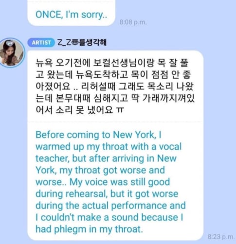 "Before coming to New York, I warmed up my throat with a vocal teacher. But after arriving in New York, my throat got worse and worse. My voice was still good during rehearsal, but it got worse during the actual performance, and I couldn’t make a sound because I had phlegm in my throat,” she said.