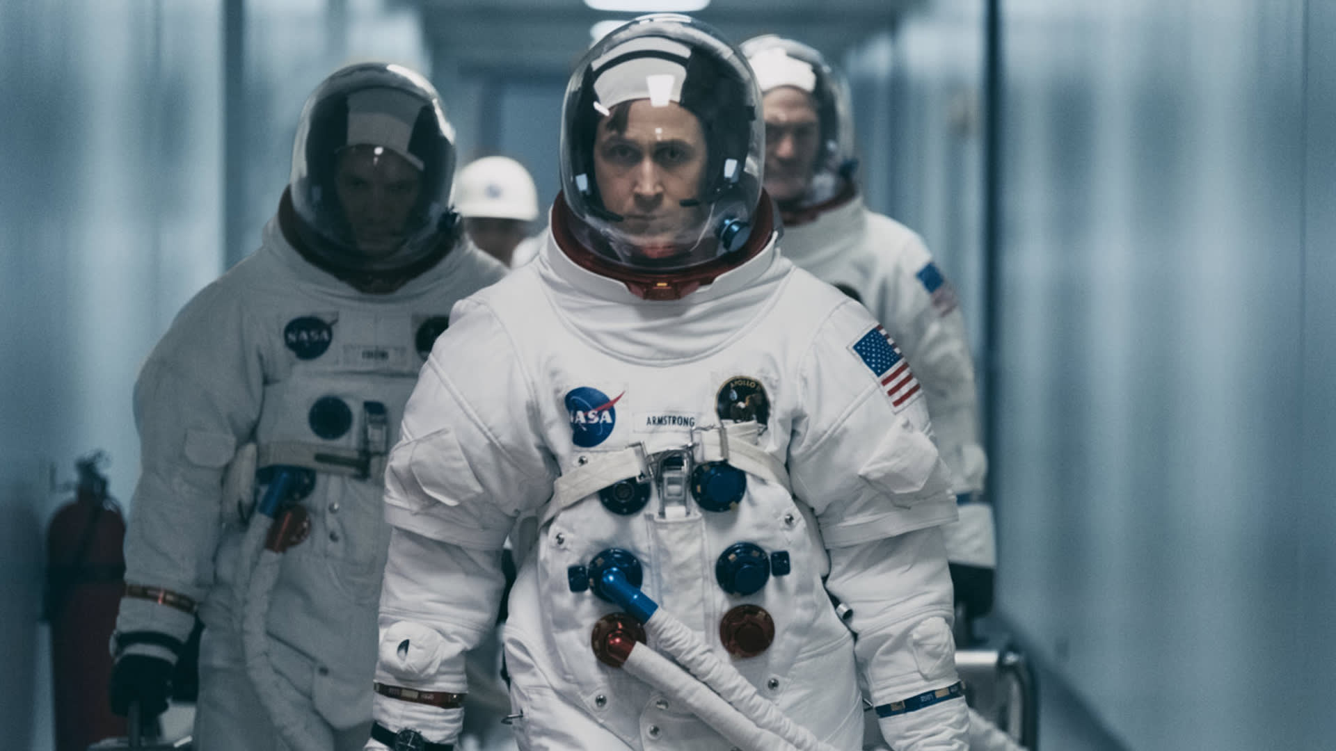 After Neil and Buzz [Aldrin, played by Corey Stoll] suited up, they have trouble opening the hatch door of the lunar lander. Based on our research, that had something to do with the air pressure difference between the lunar lander and the moon.