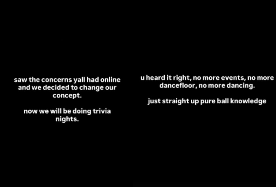 “Now we will be doing trivia nights,” they wrote in an Instagram story. In another, they added: “You heard it right, no more events, no more dancefloor, no more dancing. Just straight up pure ball knowledge.”