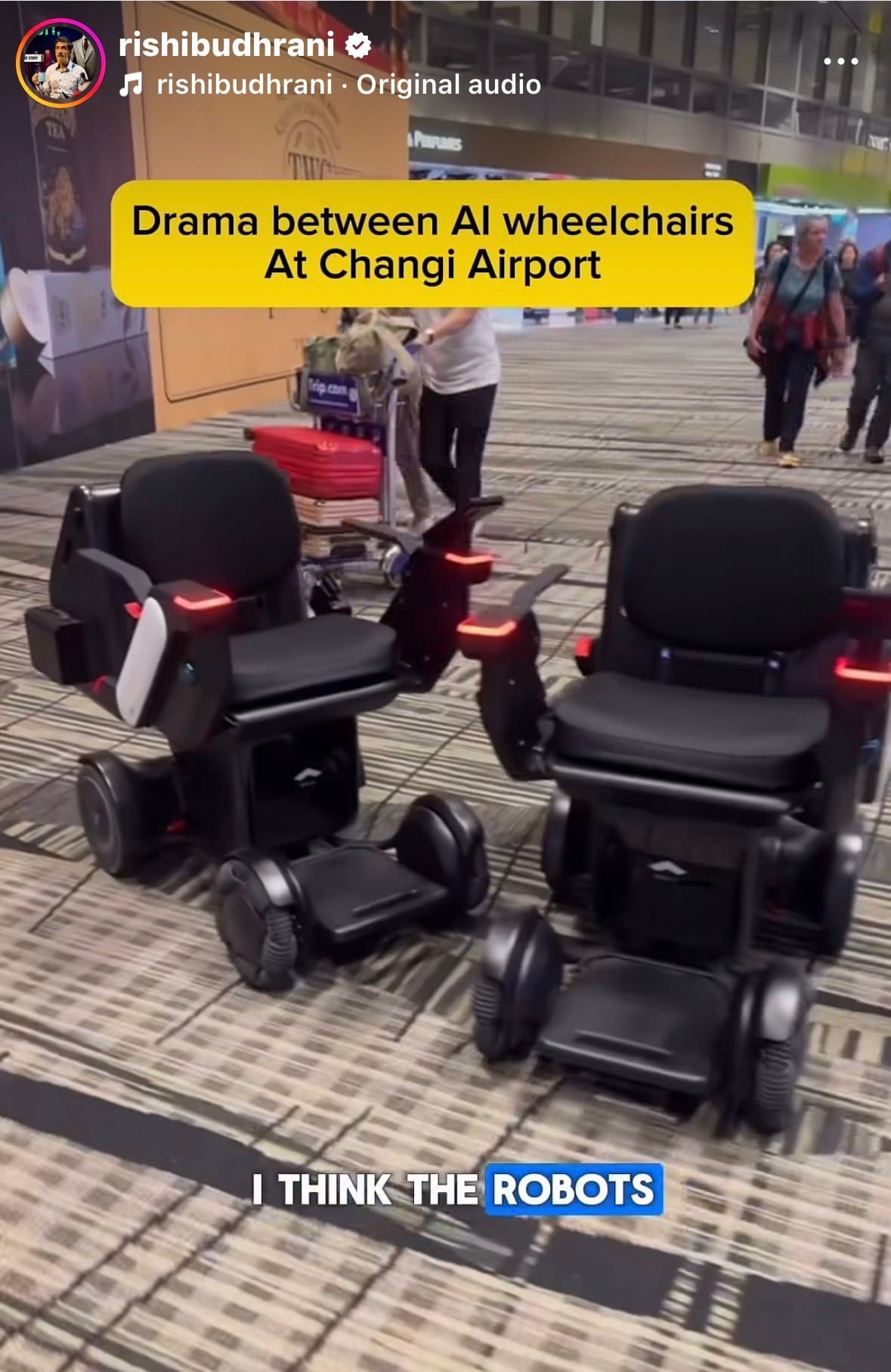 Local comedian Rishi Budhrani recently shared a hilarious clip showing what can only be described as an awkward face-off between two AI robotic wheelchairs at Changi Airport Terminal 3 on April 14.