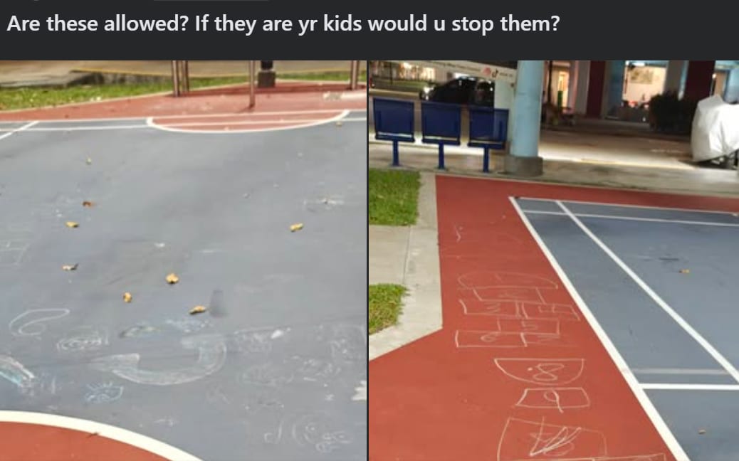 A post on Complaint Singapore recently showed photos of chalk scribbles and a hopscotch grid drawn on a badminton court, with the OP asking, “Are these allowed? If they are your kids, would you stop them?”