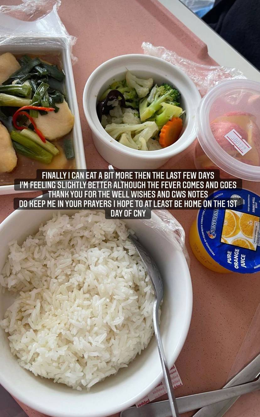 She went on to share that she had a high fever and as a result, was warded for observation, and placed on antibiotics. She also said that her reunion dinner will be in the hospital.