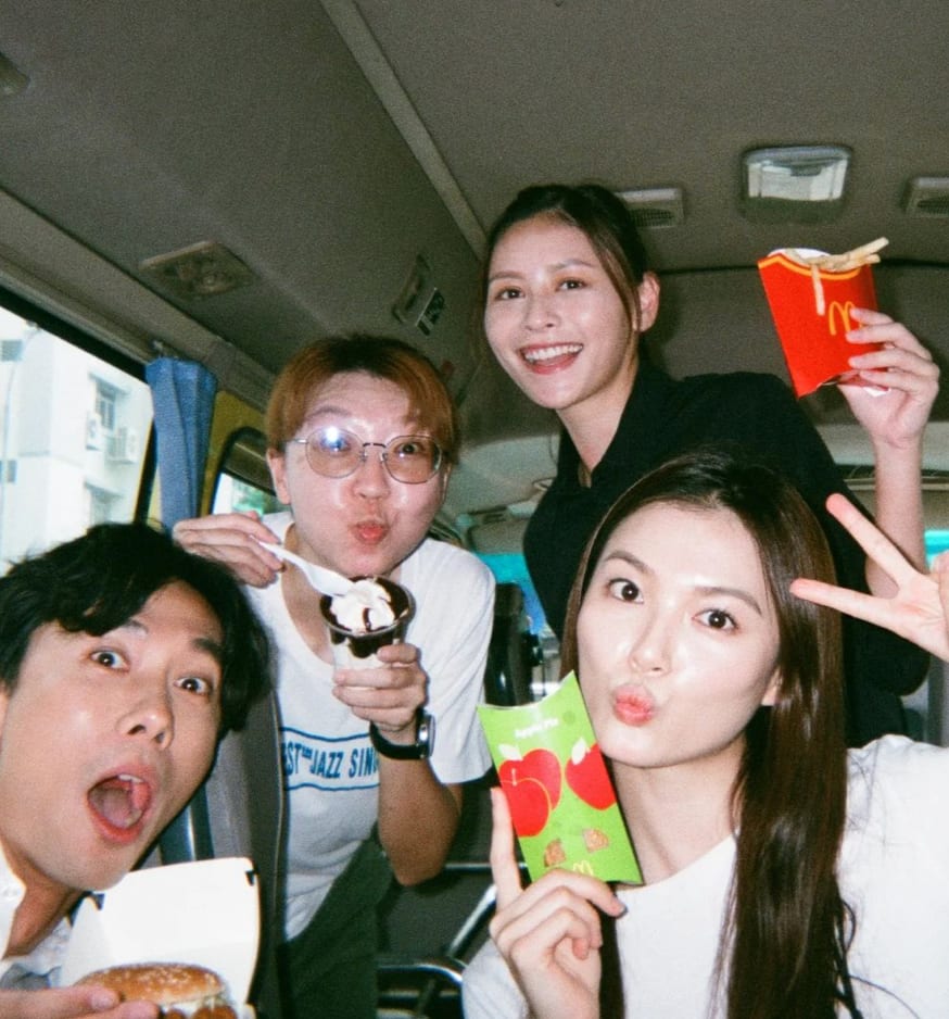 Oh yes, that's Desmond's other on-screen partner He Yingying and their director "enjoying their 'cheat meal'" with them.