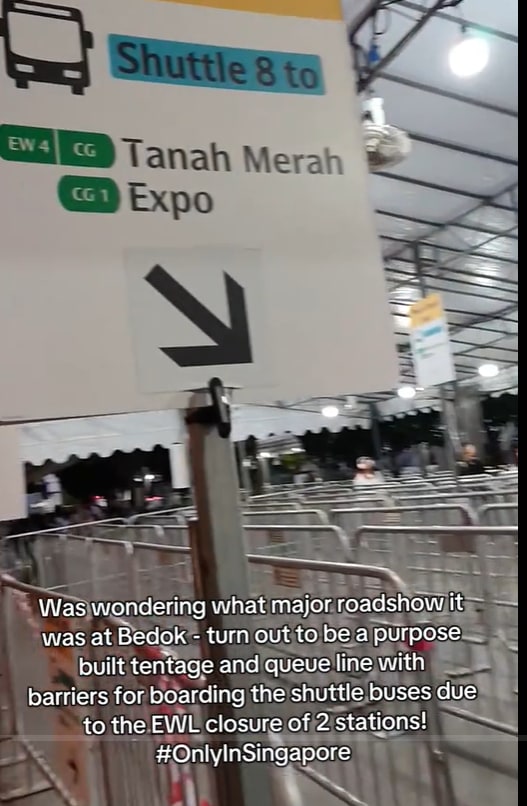 @bellaella77 posted a TikTok video of a tentage setup outside Bedok MRT station, complete with metal barricades to handle the crowd boarding shuttle buses, and was seemingly impressed by how organised it was.