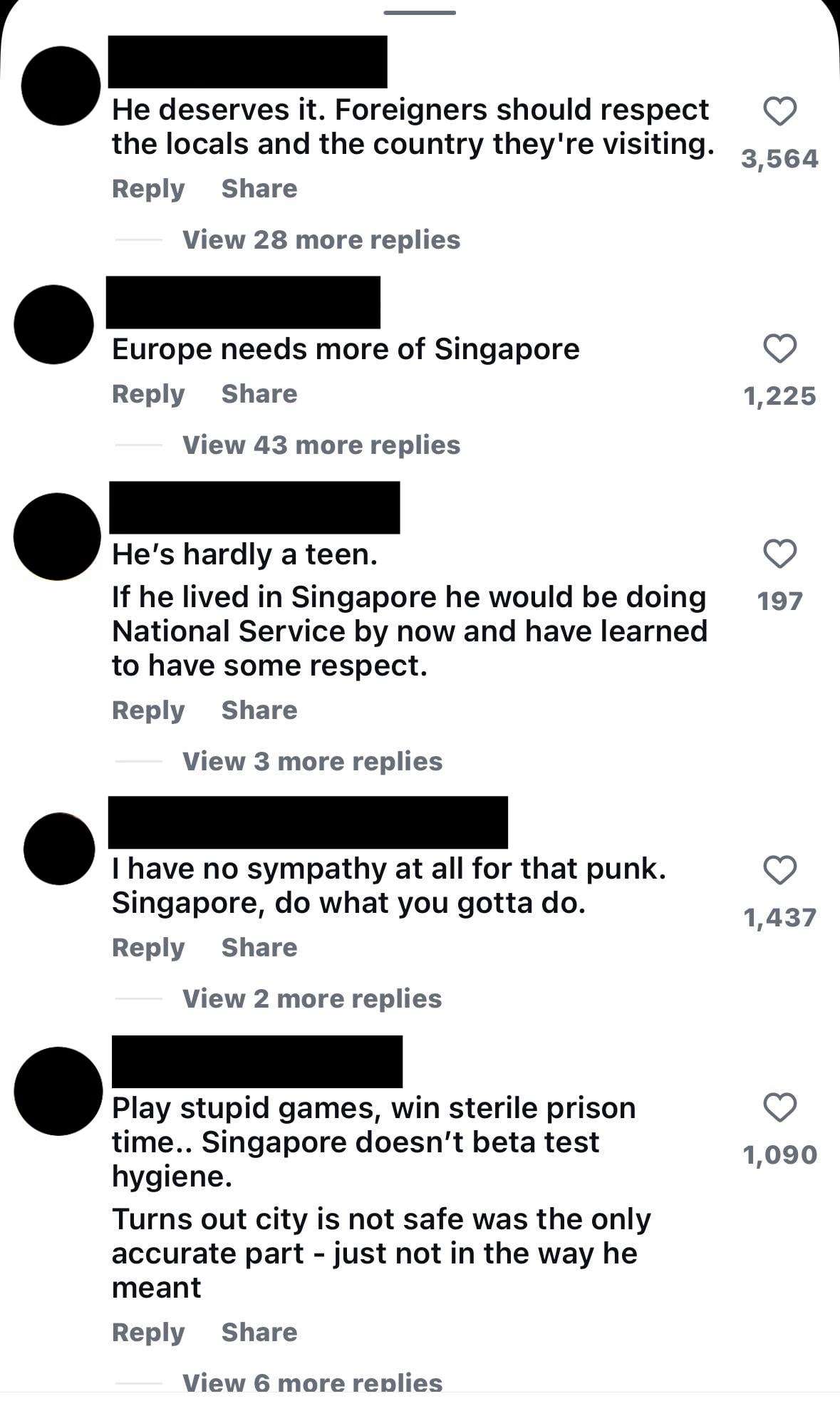 There were also comparisons between Europe and Singapore’s handling of criminals, with one netizen commenting: “I have no sympathy at all for that punk. Singapore, do what you’ve got to do.”