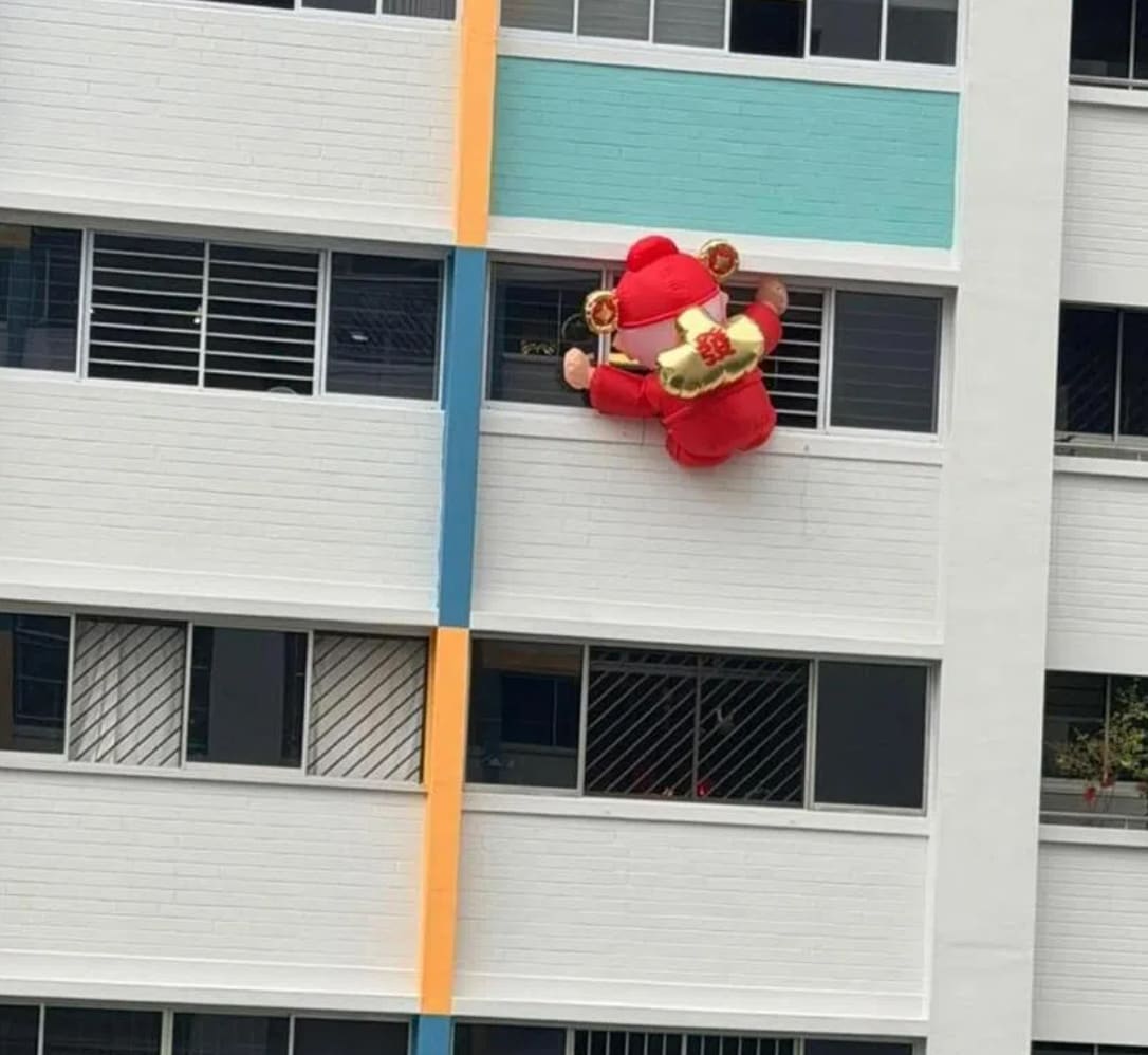 A resident recently hung a God of Fortune inflatable from the window of their eighth floor HDB flat in Choa Chu Kang. Naturally, it attracted plenty of attention from residents and passers-by, with many snapping photos of the festive decoration and sharing them online.