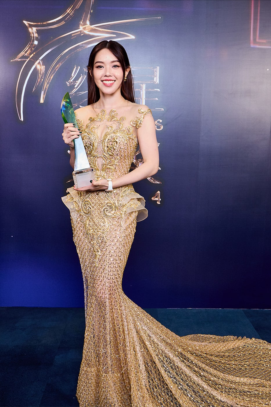 The Best Actress winner oozed old Hollywood glam in a starry off-shoulder — yes, Zhu Houren, it’s supposed to look like that — stunner on her big night. And since TV queens can never have too much glitter, she paired her celestial getup with almost $40K worth of diamonds and peridots from Yadanar Gems. Did she predict her win? Because those gems match her glossy new trophy almost perfectly. Celebs, take note: coordinate your jewels with your desired award.