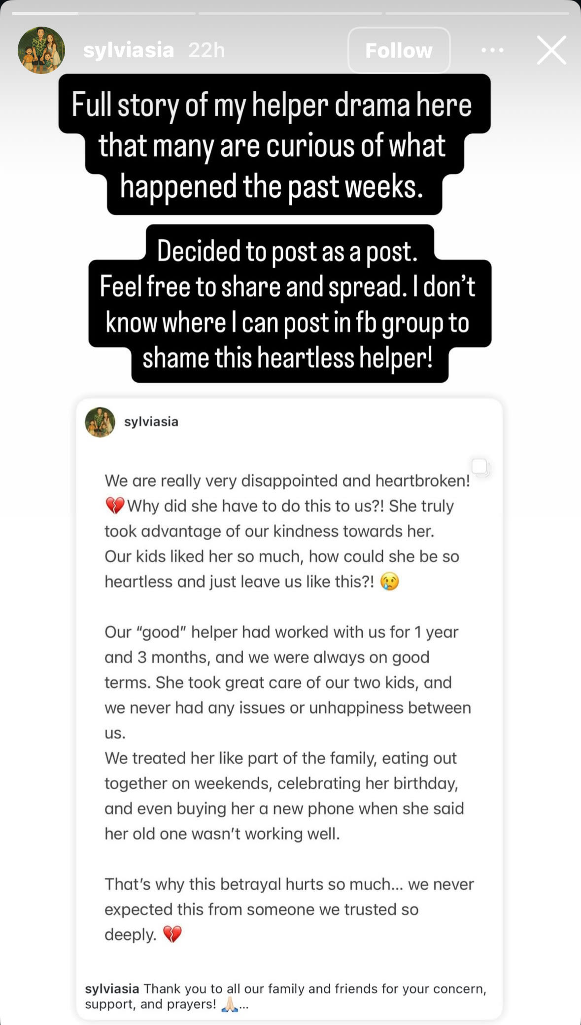 “Out of goodwill, we gave her salary in advance. At that point, we didn’t think too much of it,” Sylvia wrote, admitting in hindsight that she had been “too kind and trusting.”