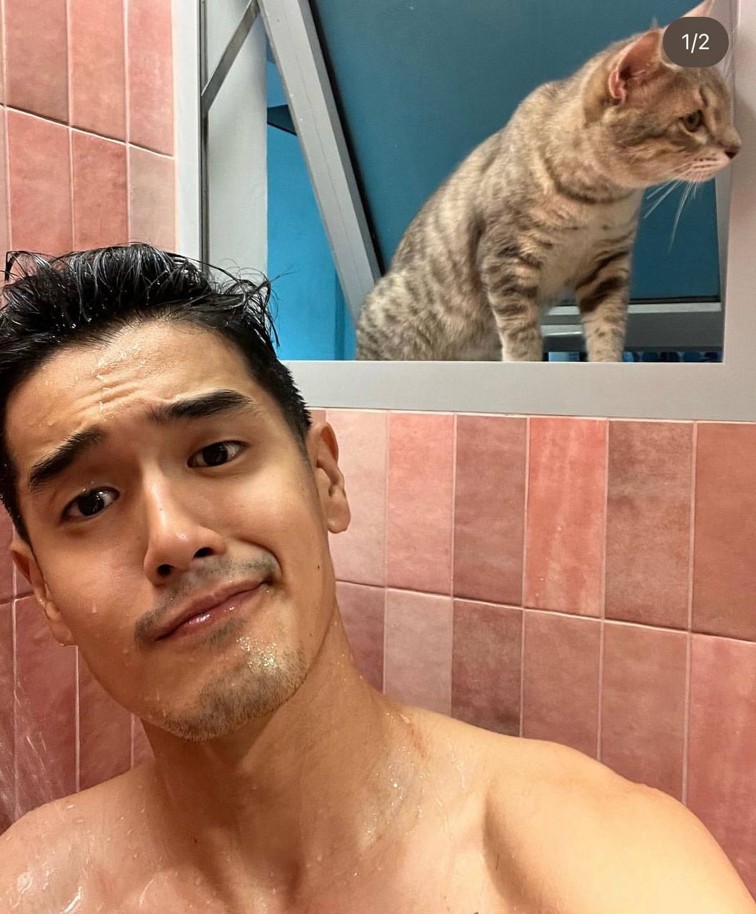 Sharing this adorable pic he took with his cat, which he brought home about three months ago, Nathan wrote: "Somebody found himself a new lil perch and it’s made showers 75% more entertaining."