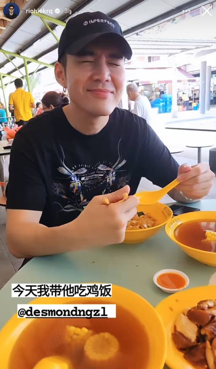 "Today I took him to eat chicken rice," wrote Richie. But um, Desmond's eating noodles leh?
