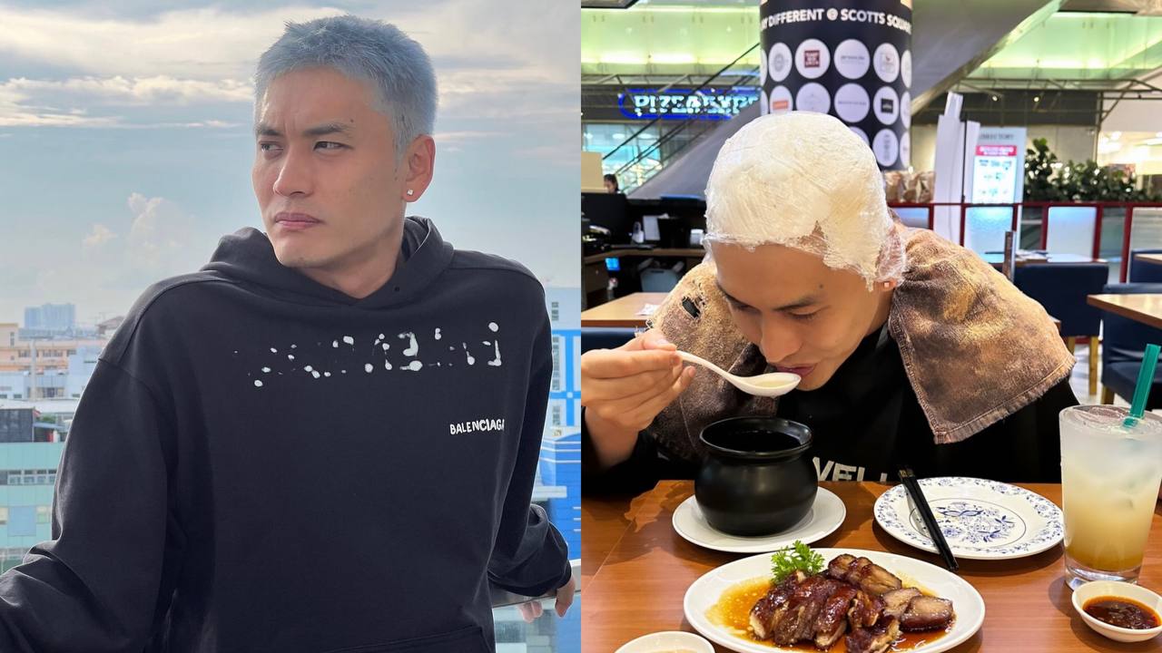 What a nice shade of blue, Jeff, but did you really have to eat char siew with hair dye and cling wrap on your hair?!