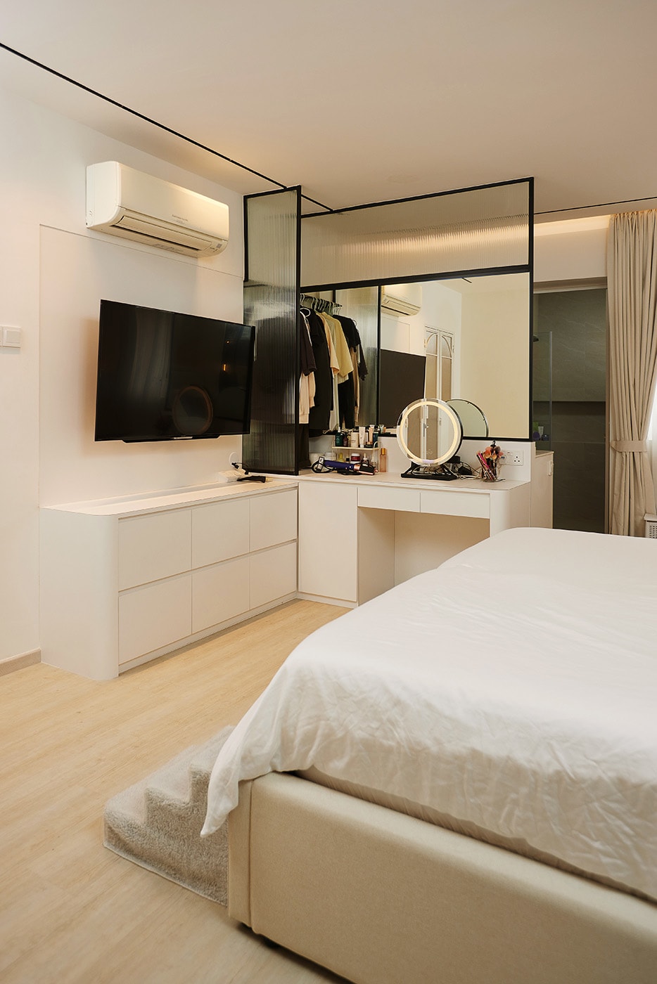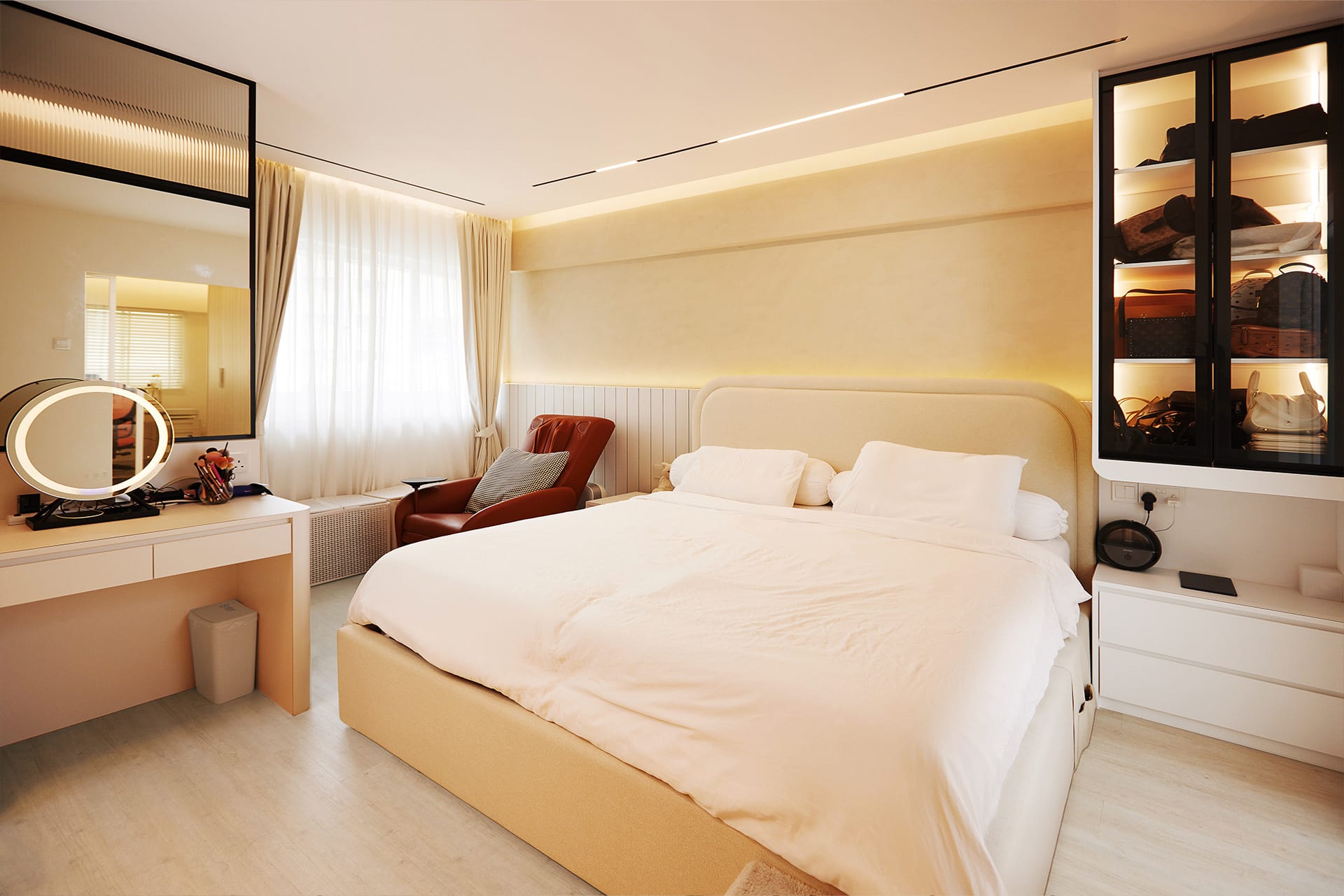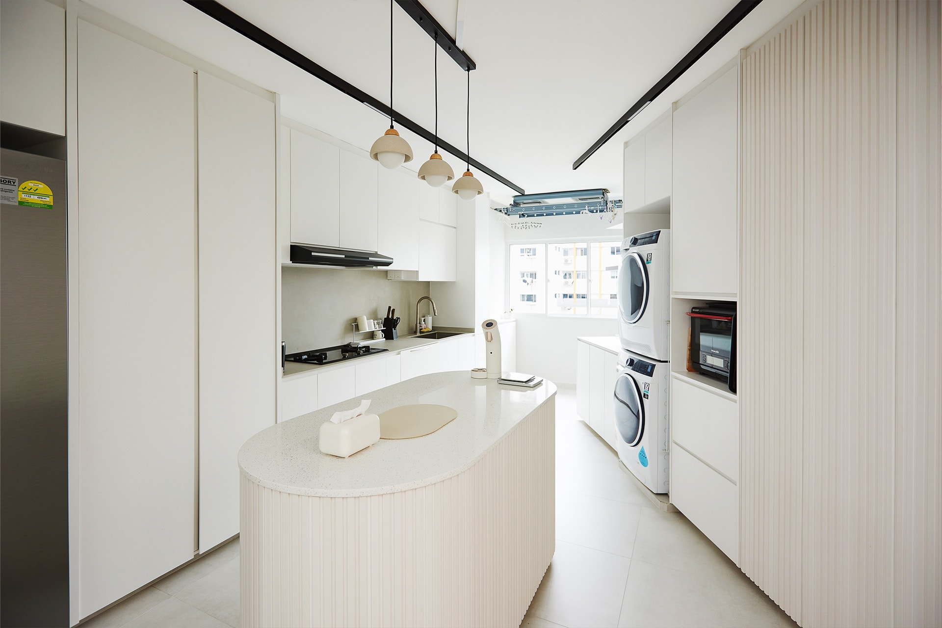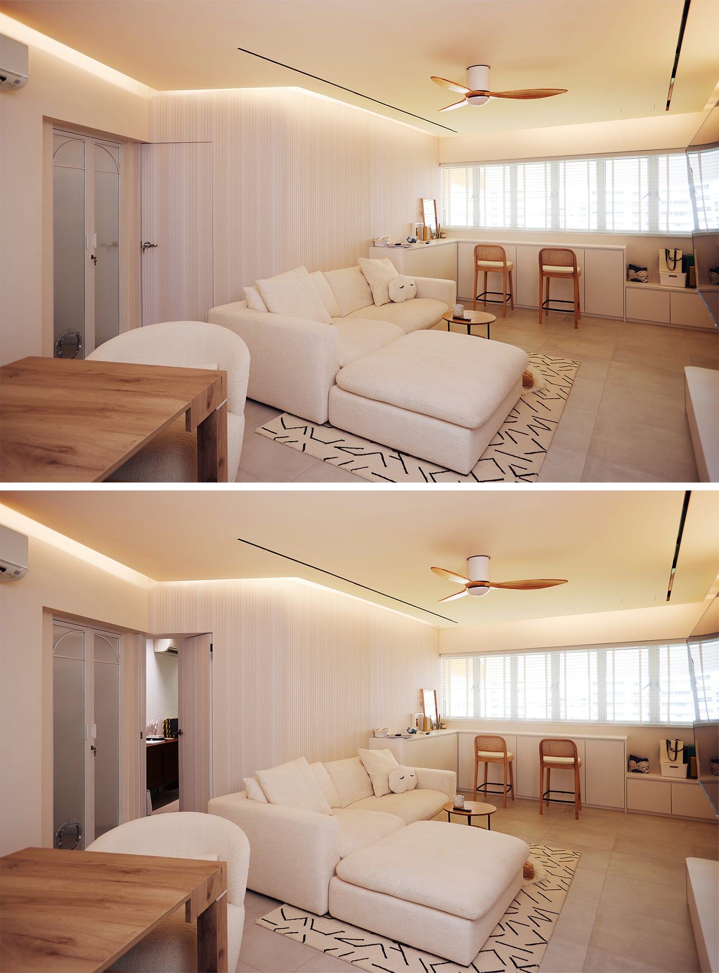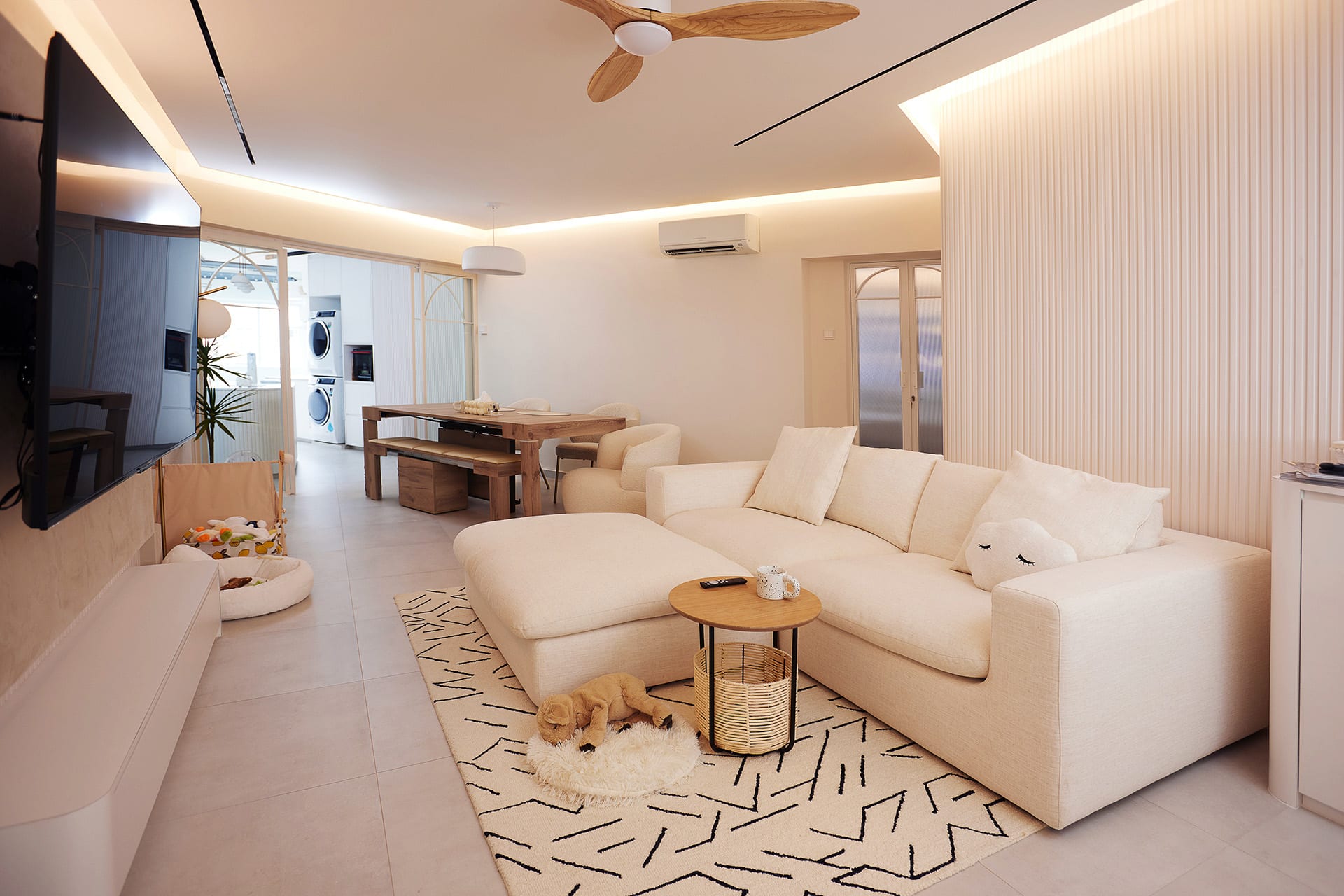 To open up the space, the wall between the kitchen and dining area was hacked and replaced with sliding glass doors, while fluted panels and limewash TV feature wall add dimension and visual interest.