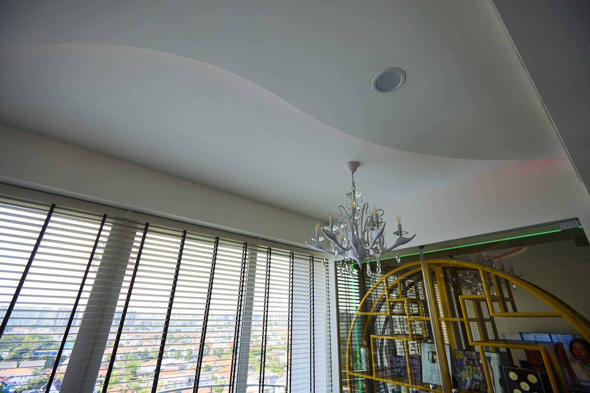 Completing the space is the curved ceiling that matches the wavy balcony. It also conceals ambient lighting that transforms the living room into a party space.