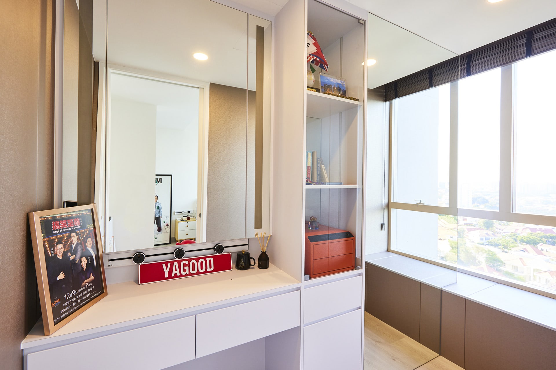Due to fengshui, the original master bathroom was converted into a dressing area and space for Jaspers to keep things that are valuable to him like his newspaper clippings, safe, a poster with his three mentors, Mark, Jack Neo, and Henry Thia, as well as books on the late Lee Kuan Yew.