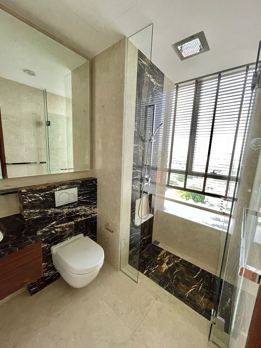 “I bought the apartment for the view, so I want to enjoy it when I shower or when I am doing my business. It would be a waste to block it. Having a glass toilet also gives the room a hotel vibe.”