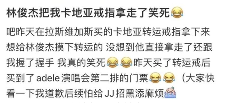 However, according to their post, JJ mistook the fan's Cartier ring for a gift and kept it after “thanking them with a handshake”.