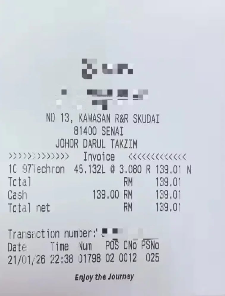 The incident occurred on Jan 21 at around 9pm at a Caltex petrol station located at a highway rest stop in the Skudai area in Johor.