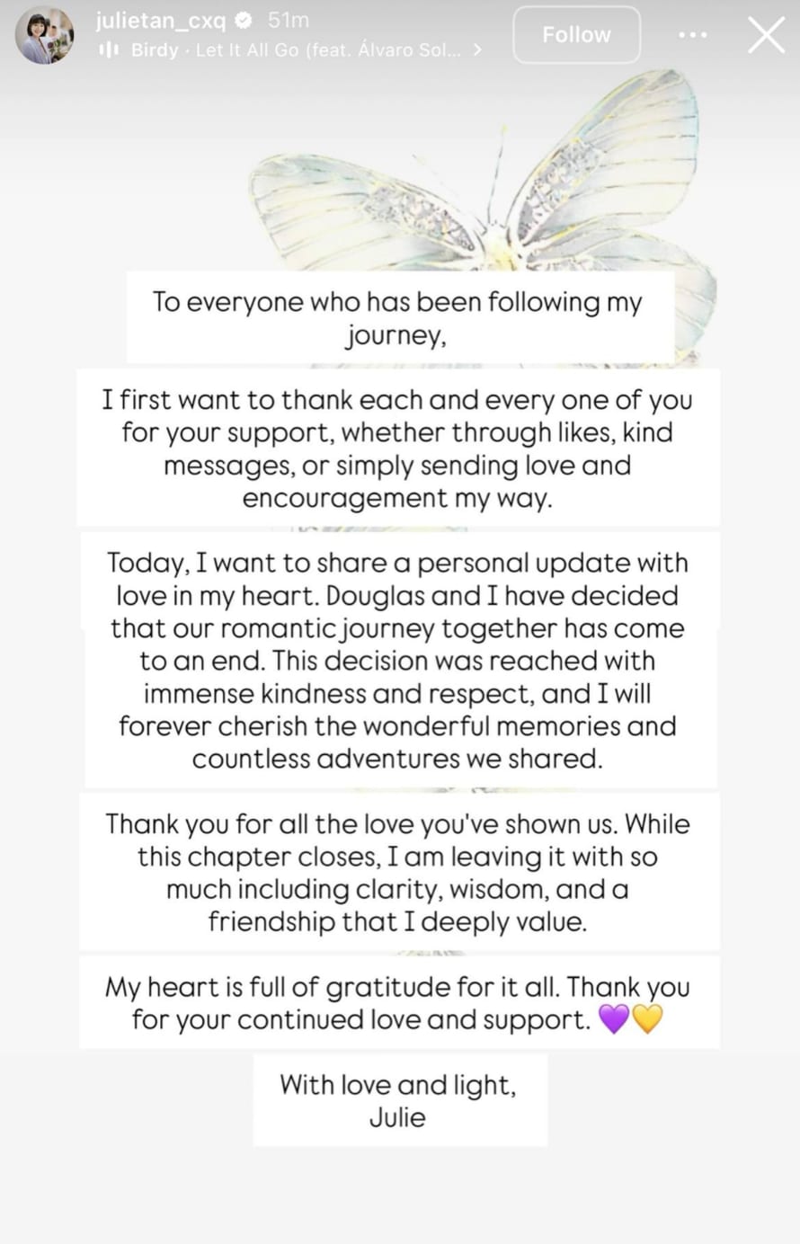 Julie Tan Splits With Influencer Boyfriend Douglas Tan: "The Decision Was Reached With Immense Kindness & Respect"