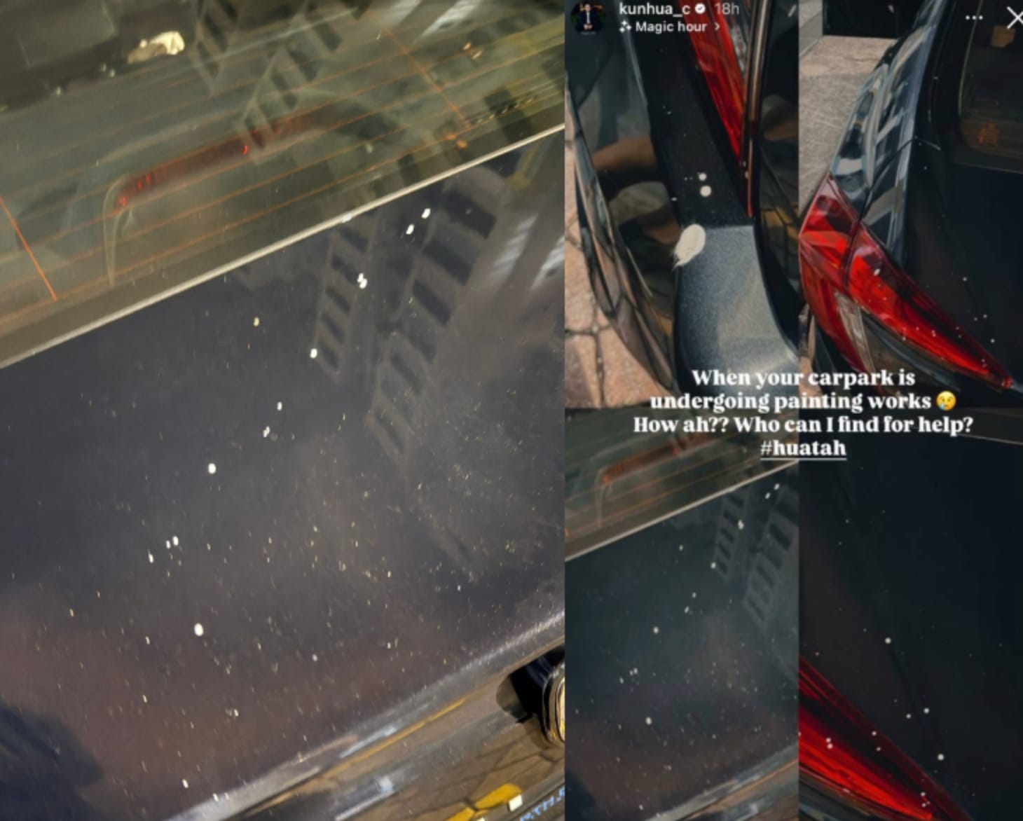 Earlier this week, Kunhua took to Instagram to share a collection of photos showing the rear of his black car dotted with small splatters of white paint.