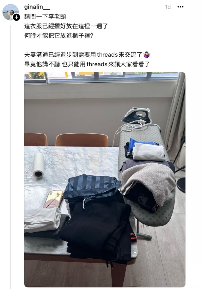 Sharing a picture of some of Lee Teng's clothes that have been left on a table and ironing board, Gina lamented: "May I ask, Old Man Lee, these clothes have been folded and placed here for a week. When can you put them in the cupboard?"