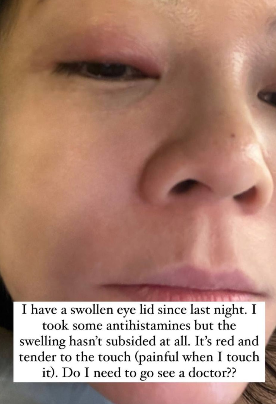 "I took some antihistamines but the swelling hasn't subsided at all. It's red and painful when I touch it. Do I need to go see the doctor?," she asked, attaching a picture showing her slightly swollen eye.