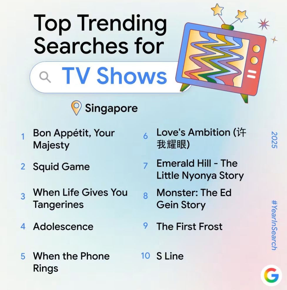 On the entertainment front, Mediacorp’s blockbuster drama Emerald Hill was one of the most searched shows, earning its place alongside global favourites such as Netflix’s Bon Appetit, Your Majesty and Squid Game.