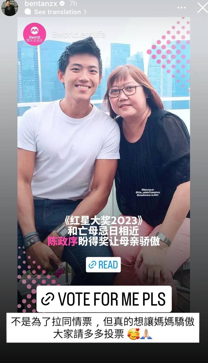 The 29-year-old actor shared in an IG Story that Star Awards this year will take place a week before his mum’s death anniversary, and that he hopes to win an award to make his late mum proud.