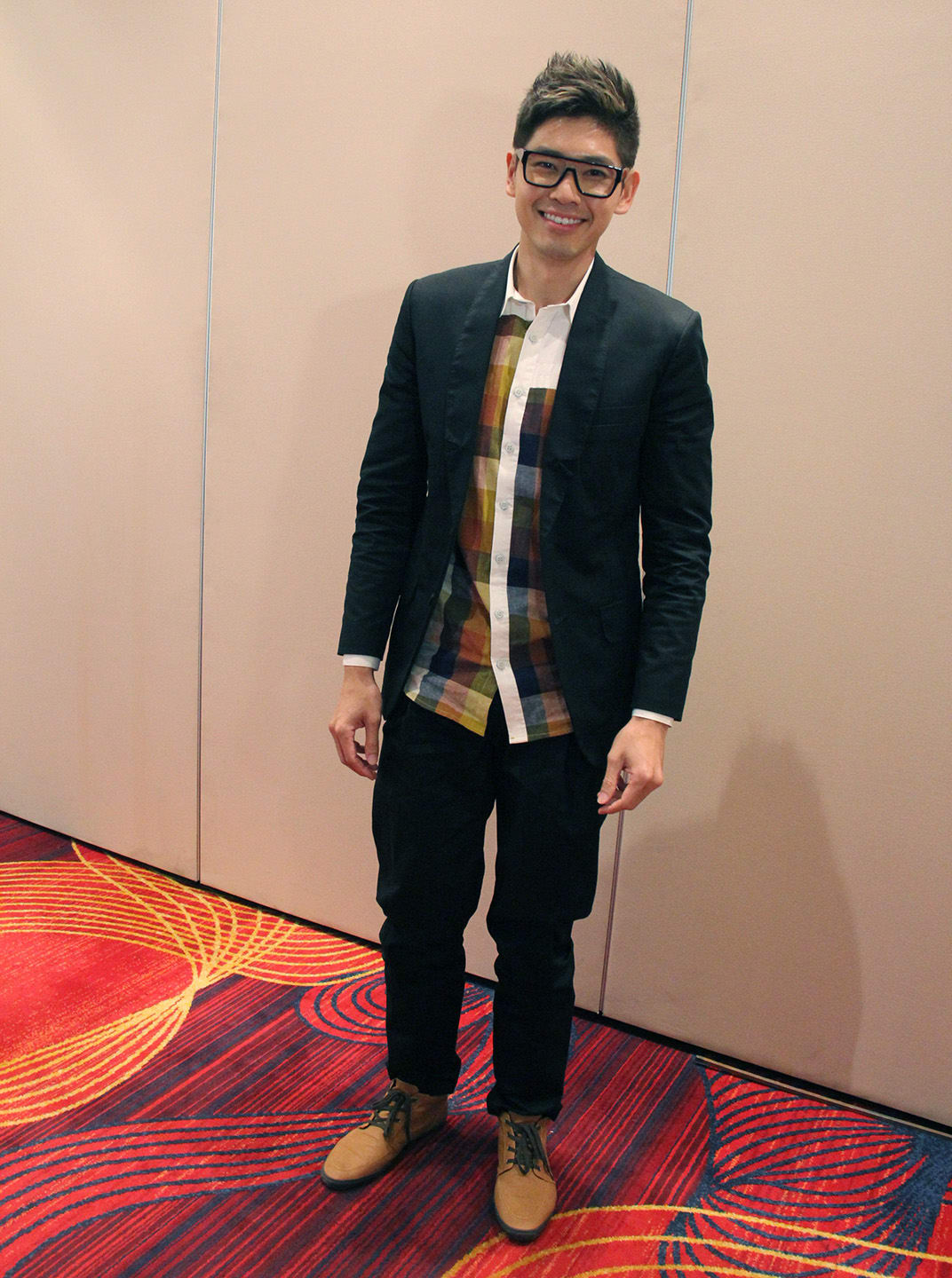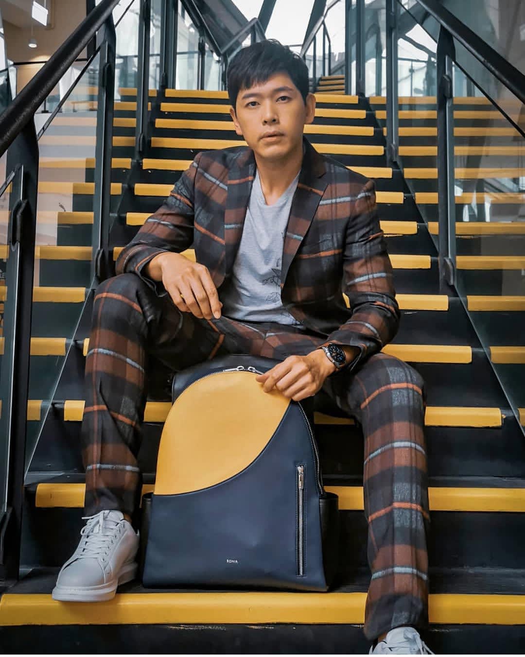 We don't know which we like more: Romeo's plaid suit or the one-of-a-kind Bonia backpack he designed himself.
