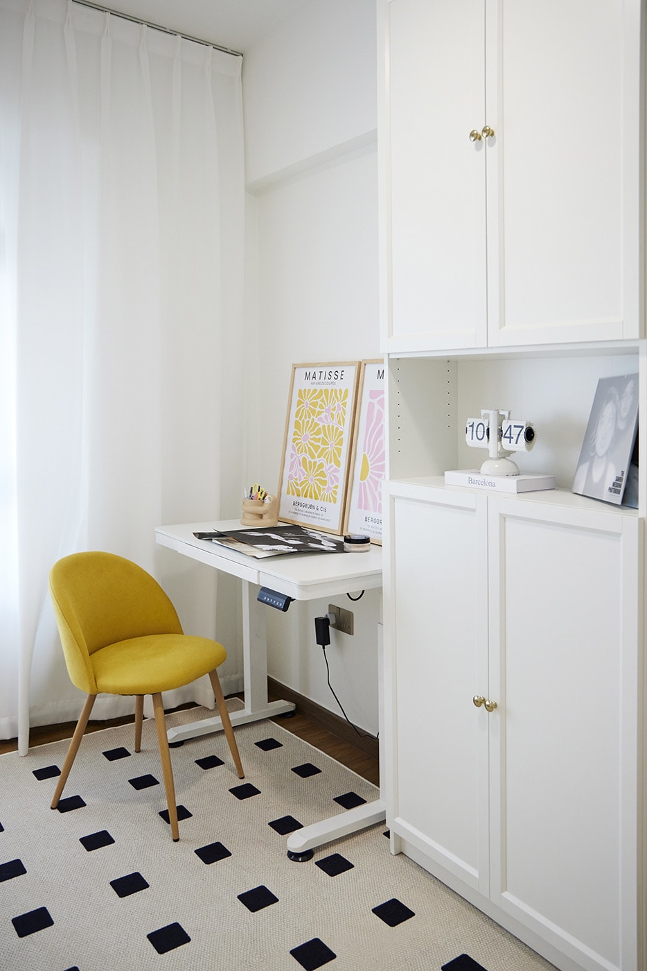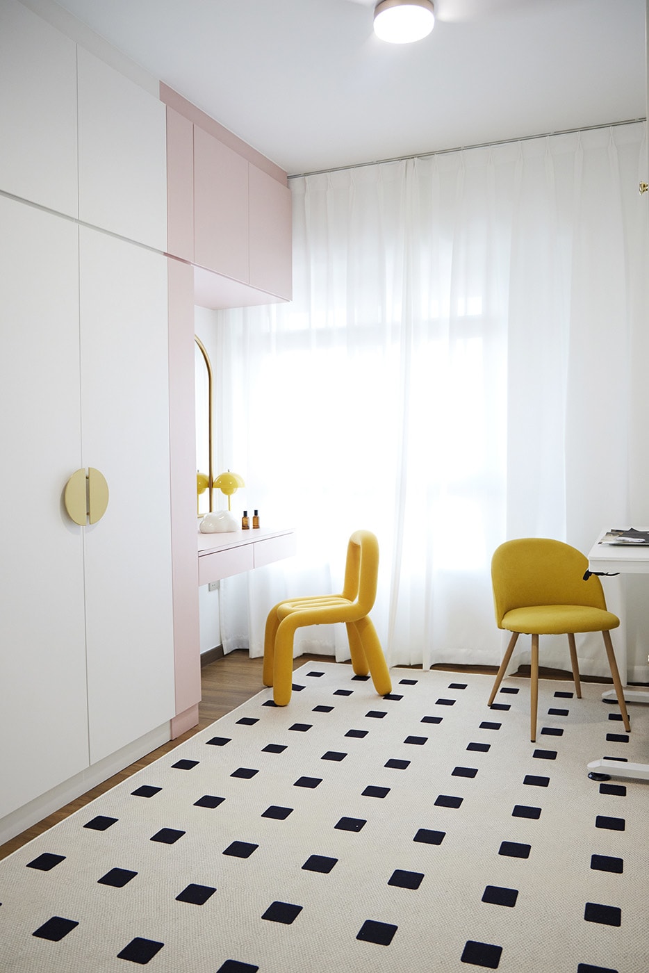 Her dressing room and study is a cosy eclectic space. Qijia found herself drawn to pink (blame it on Barbie) and mustard when designing the home and decided to pair the hues together. The combination is surprising but works.