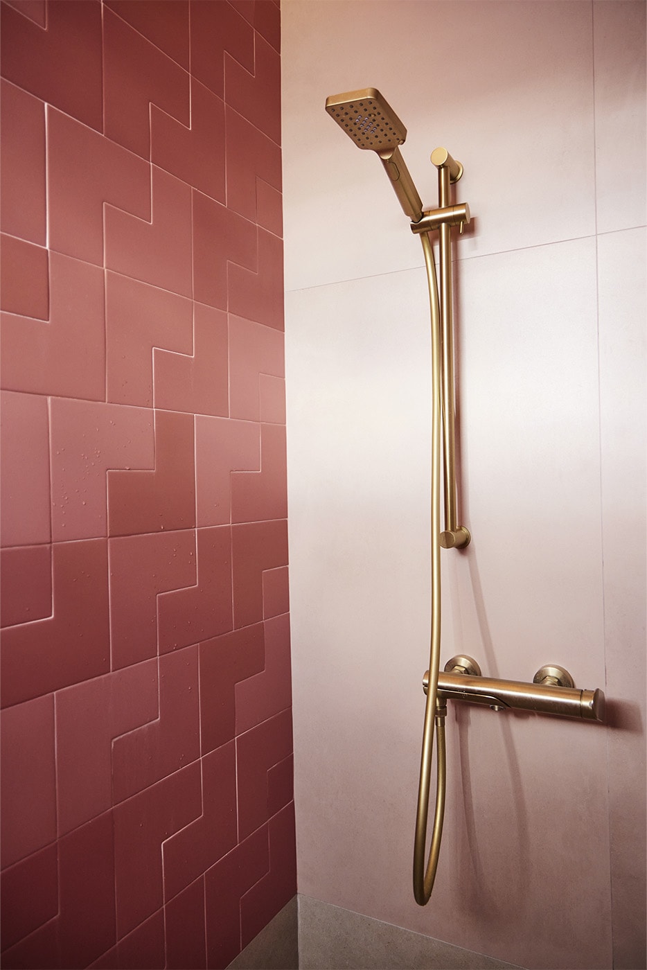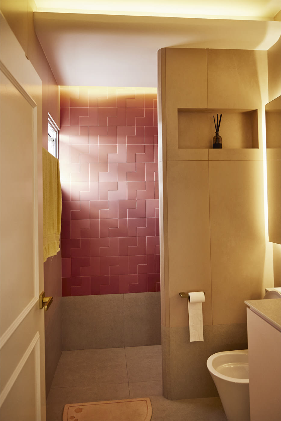 “We overlaid all the tiles and flooring in the bathroom and added cove lighting and sintered stone vanity to match the pastel pink and grey wall tiles. This is where I unwind at the end of the day and I wanted it to be relaxing,” she says.