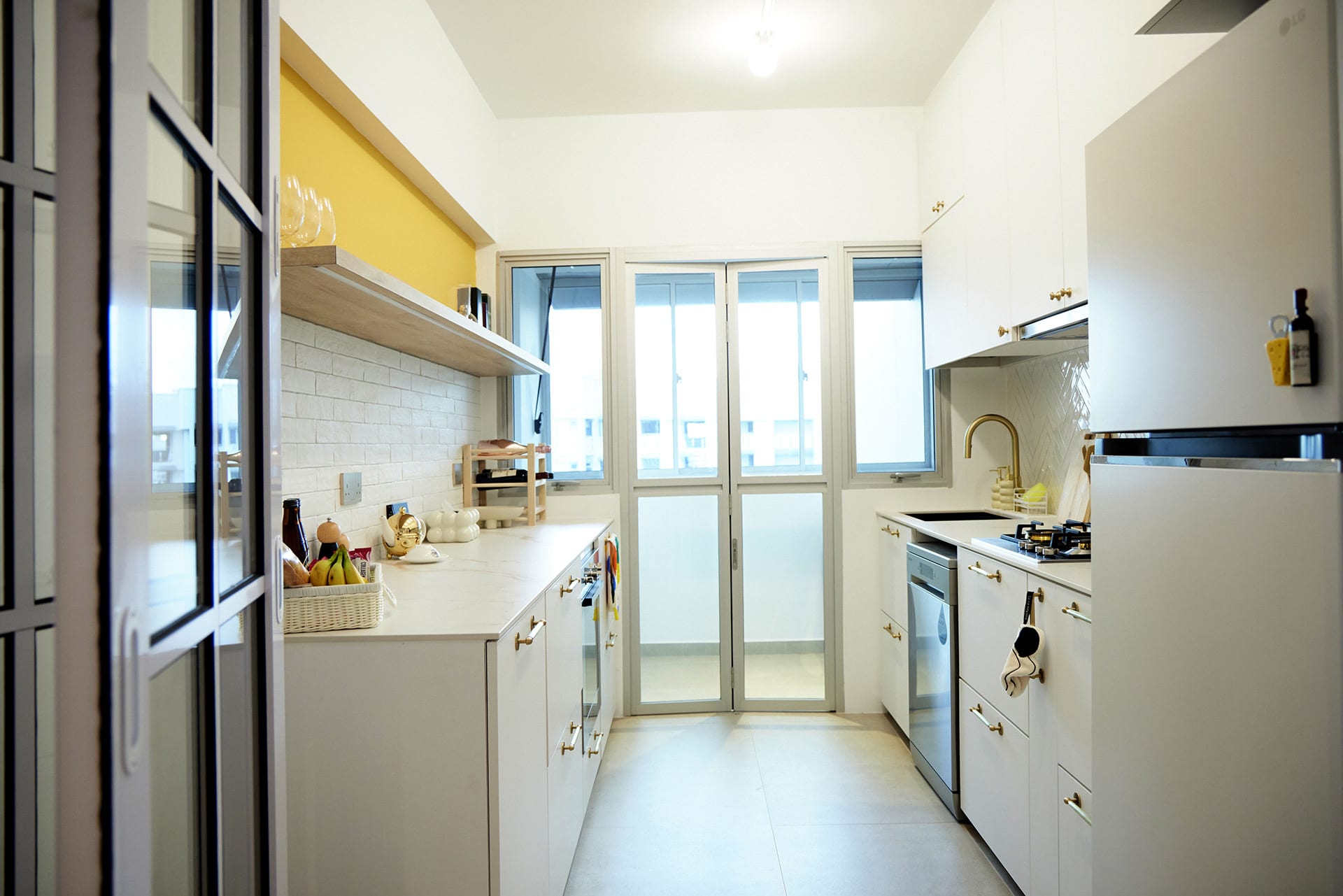 Instead of full-height cabinets on both sides of the kitchen, Qijia opted for an open shelf to display her knick knacks and tableware.