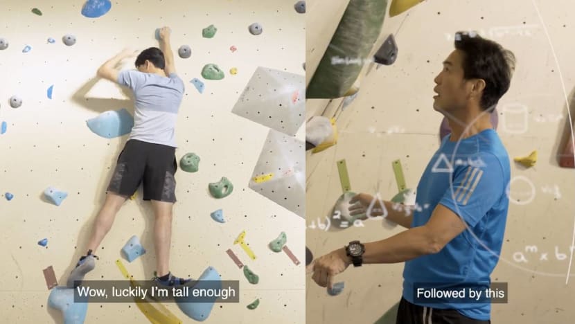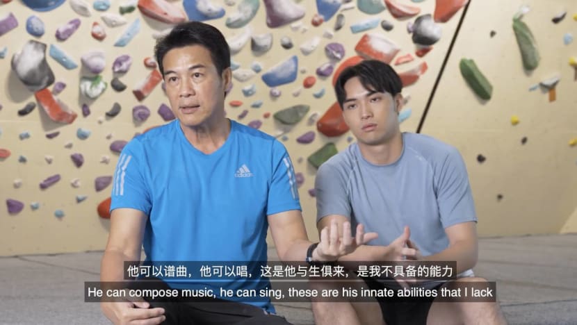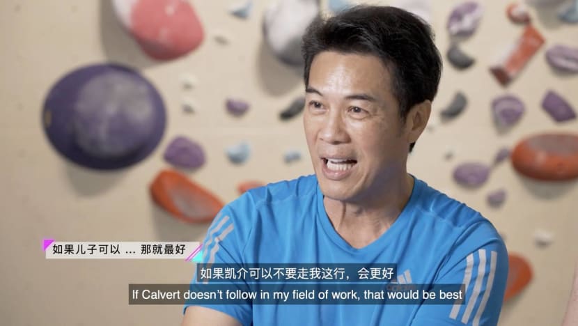 To celebrate the special day, Mediacorp's bite-sized entertainment and lifestyle series #JustSwipeLah, brought father and son duo, Zheng Geping, 58, and Calvert Tay, 22, out for a spot of bouldering.