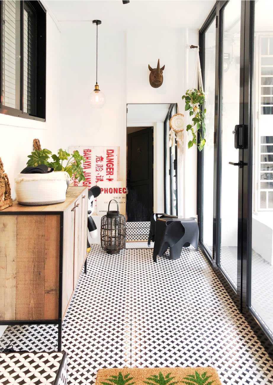 You’ll notice a huge transformation even before you step into the flat. The entryway area along the corridor was given a complete makeover. Replacing the metal grill gate with glass doors allowed more natural light to flood in. New tiles and displaying a selection of the owner’s quirky knick knacks also help to brighten and liven up the space.