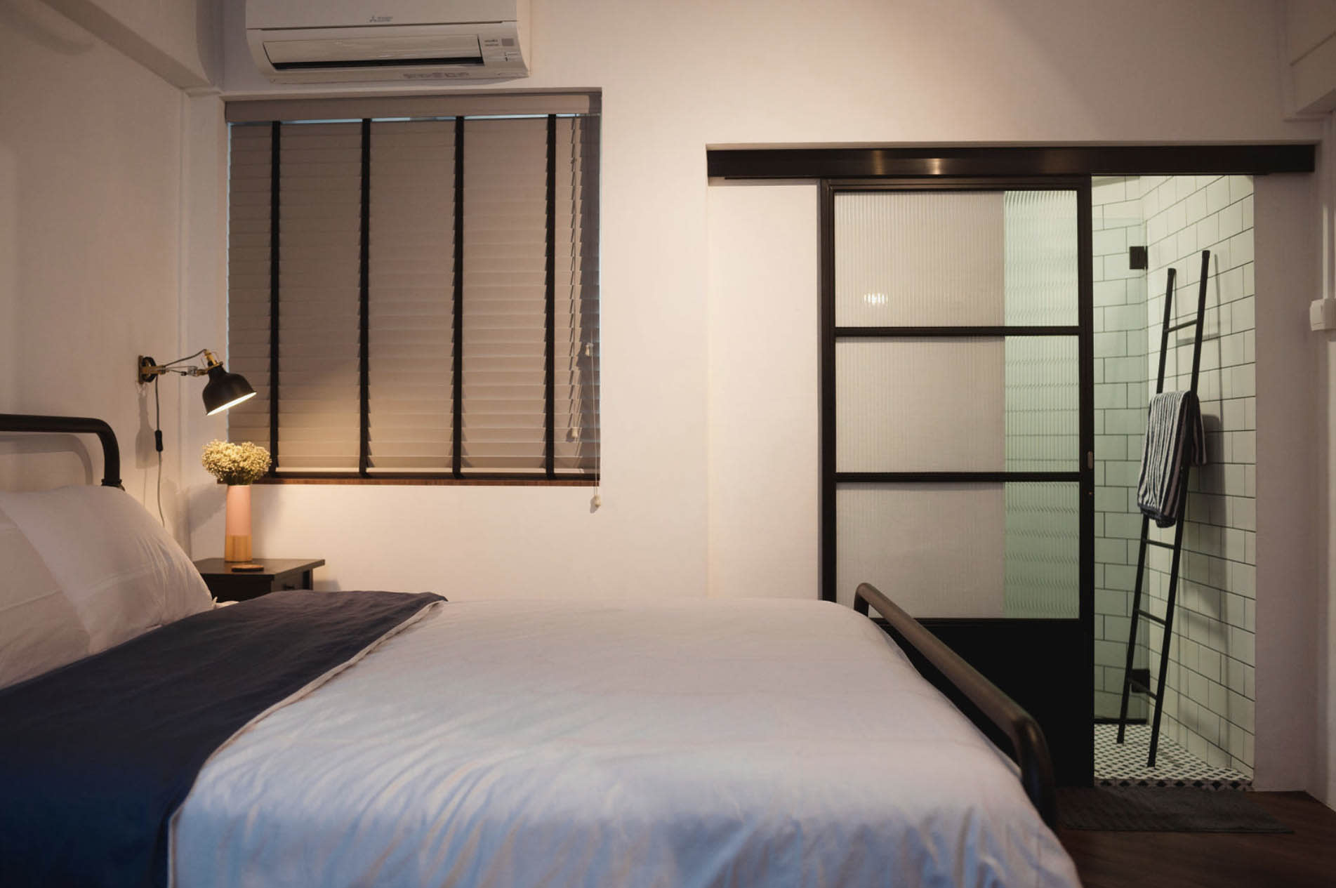 While the bedroom is kept simple with hints of industrial elements in the décor, the monochromatic mosaic patterned floor tiles in the master bathroom ties in the colonial element in the design.
