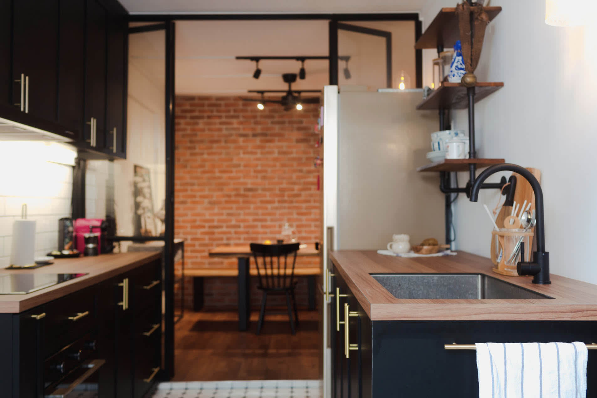 Post-reno, the updated kitchen exudes chic café vibes with black cabinets, shaker style details and brass accessories.