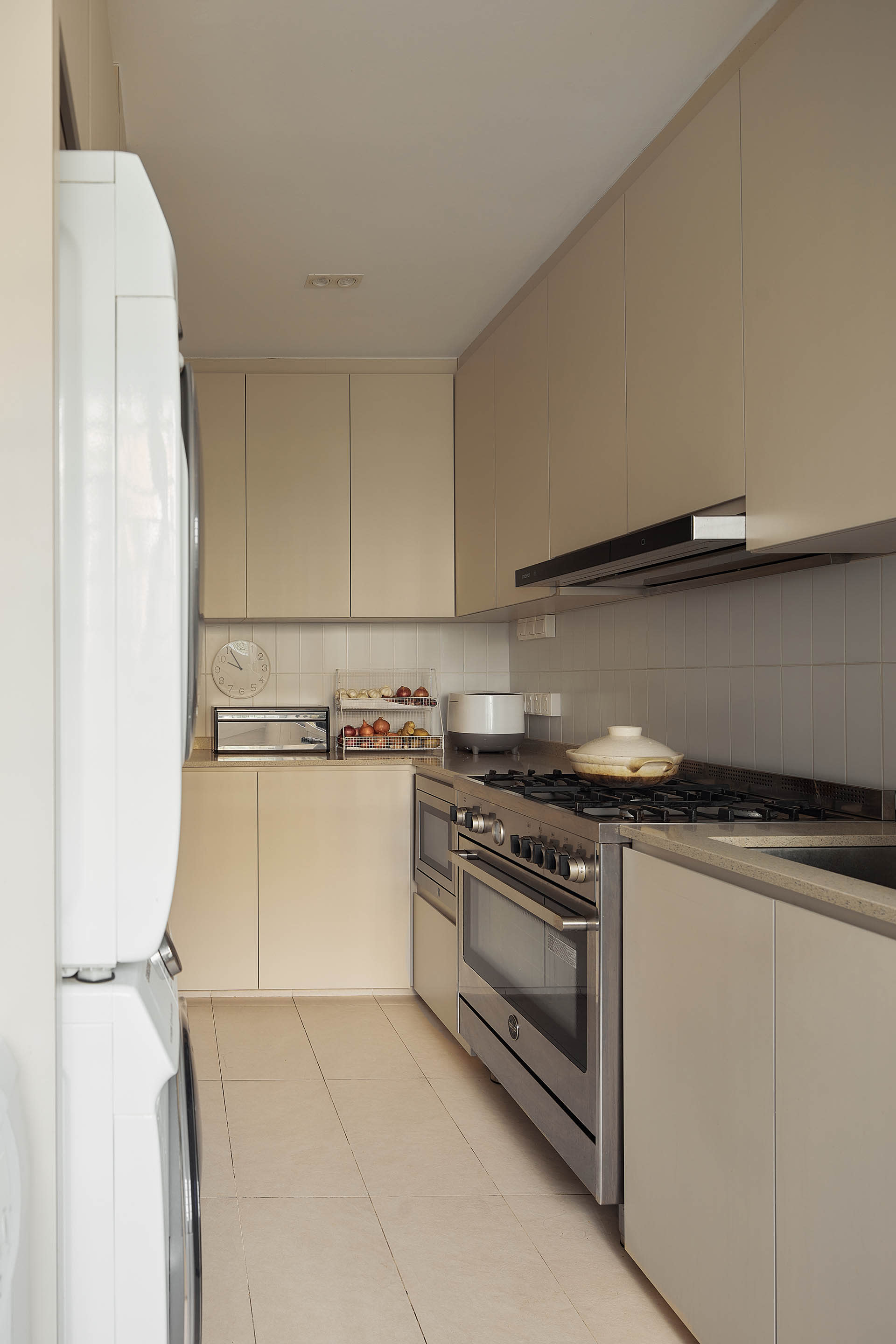 Full height storage was also added to the kitchen. Despite this, it doesn’t overwhelm the space thanks to the neutral palette and clean lines of the cabinetry, which lends itself to the overarching interior style of the house.