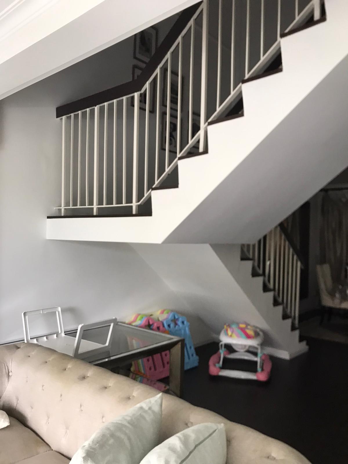 While the homeowners had initially wanted to replace the dark wood flooring to a lighter one to visually enlarge the space, they decided to keep the existing flooring and the staircase balustrade in the end due to budget constraints, and worked around it to achieve their desired interior style.